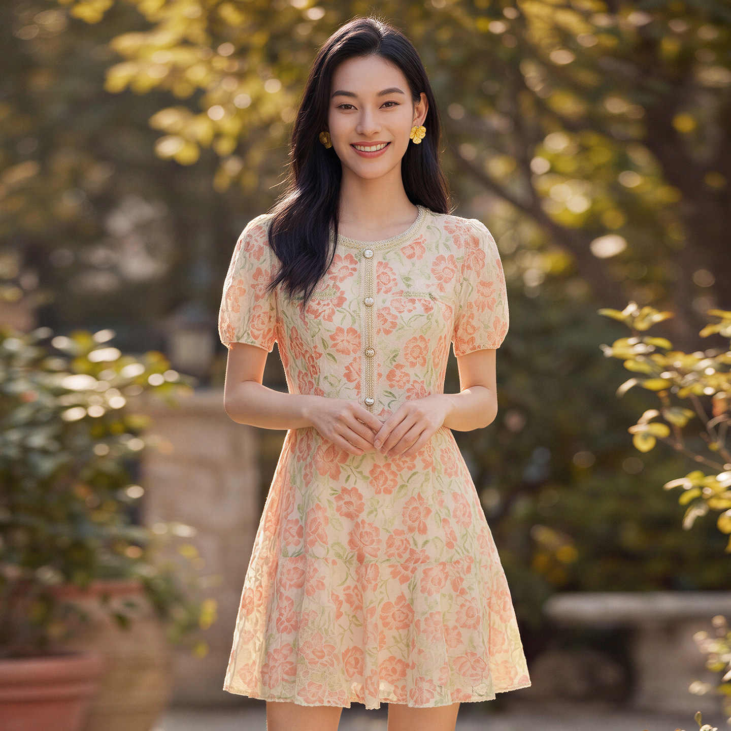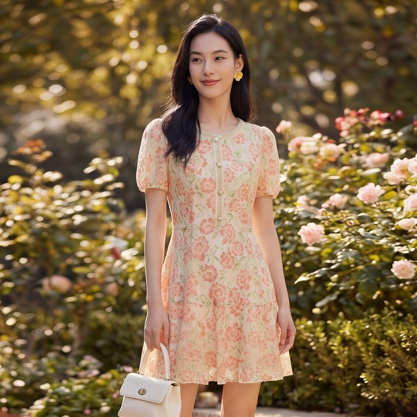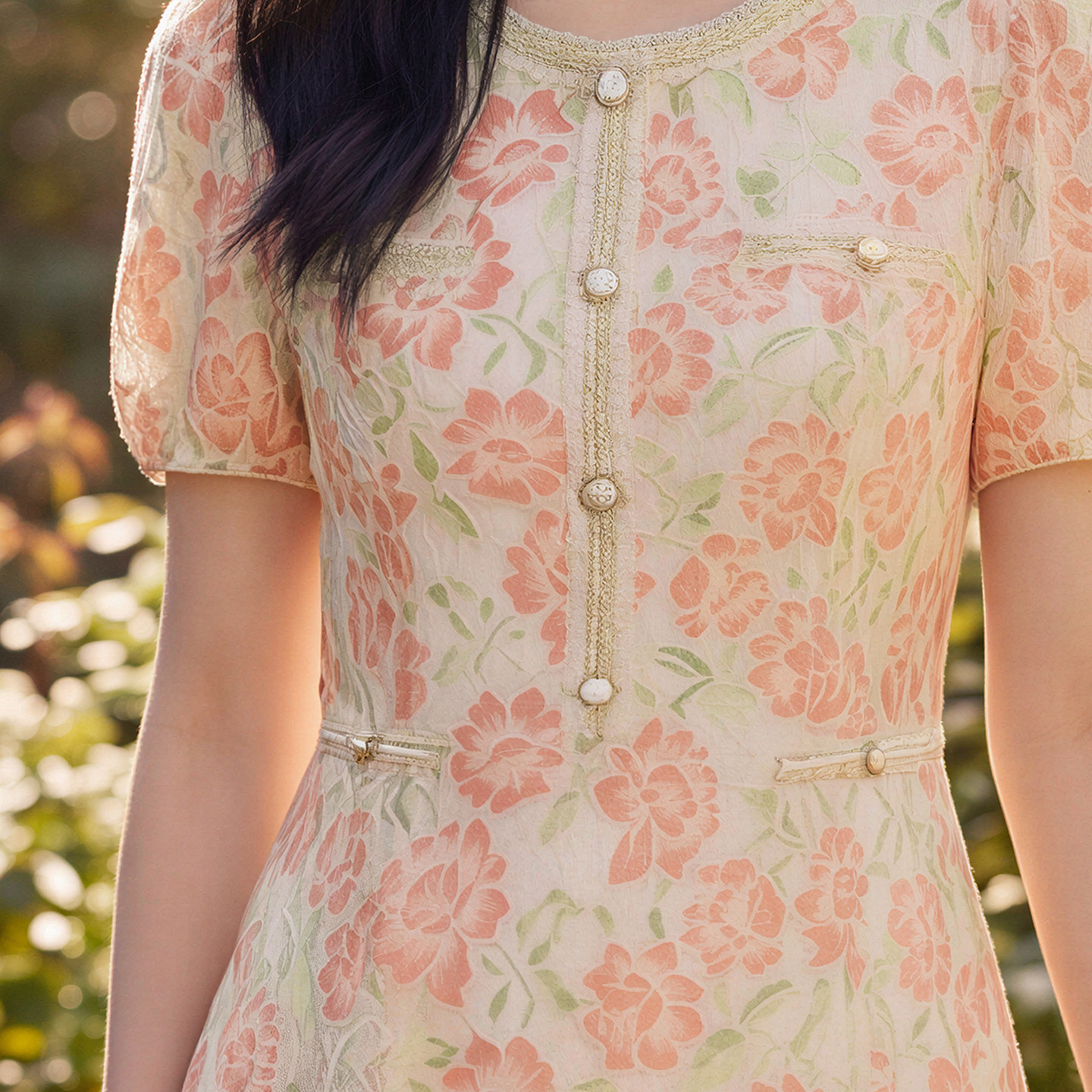 花卉蕾丝连衣裙圆领泡泡袖 新款 马天奴2026夏季 高腰裙A型 TENO