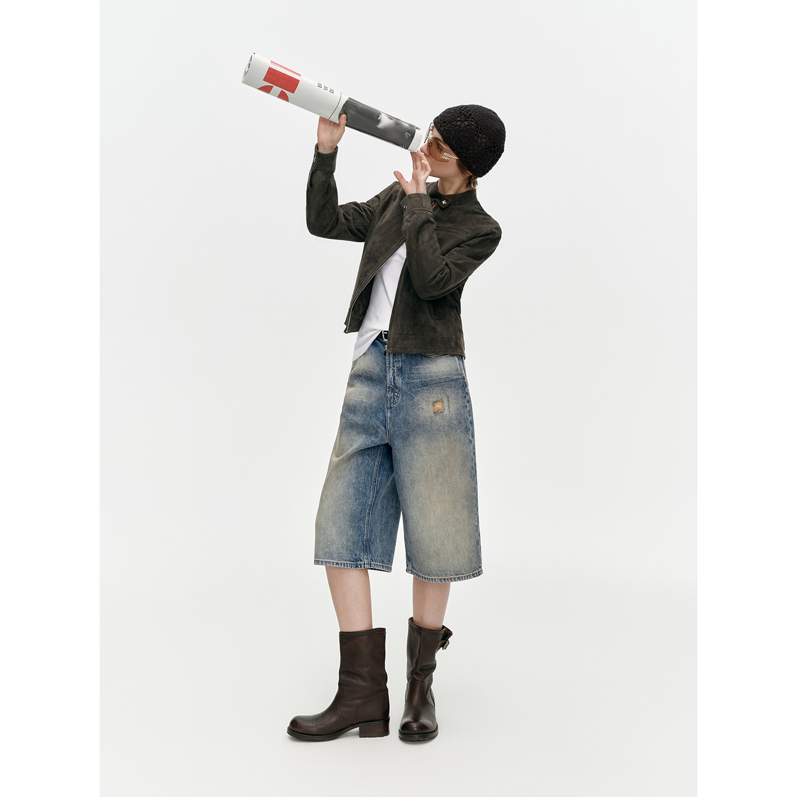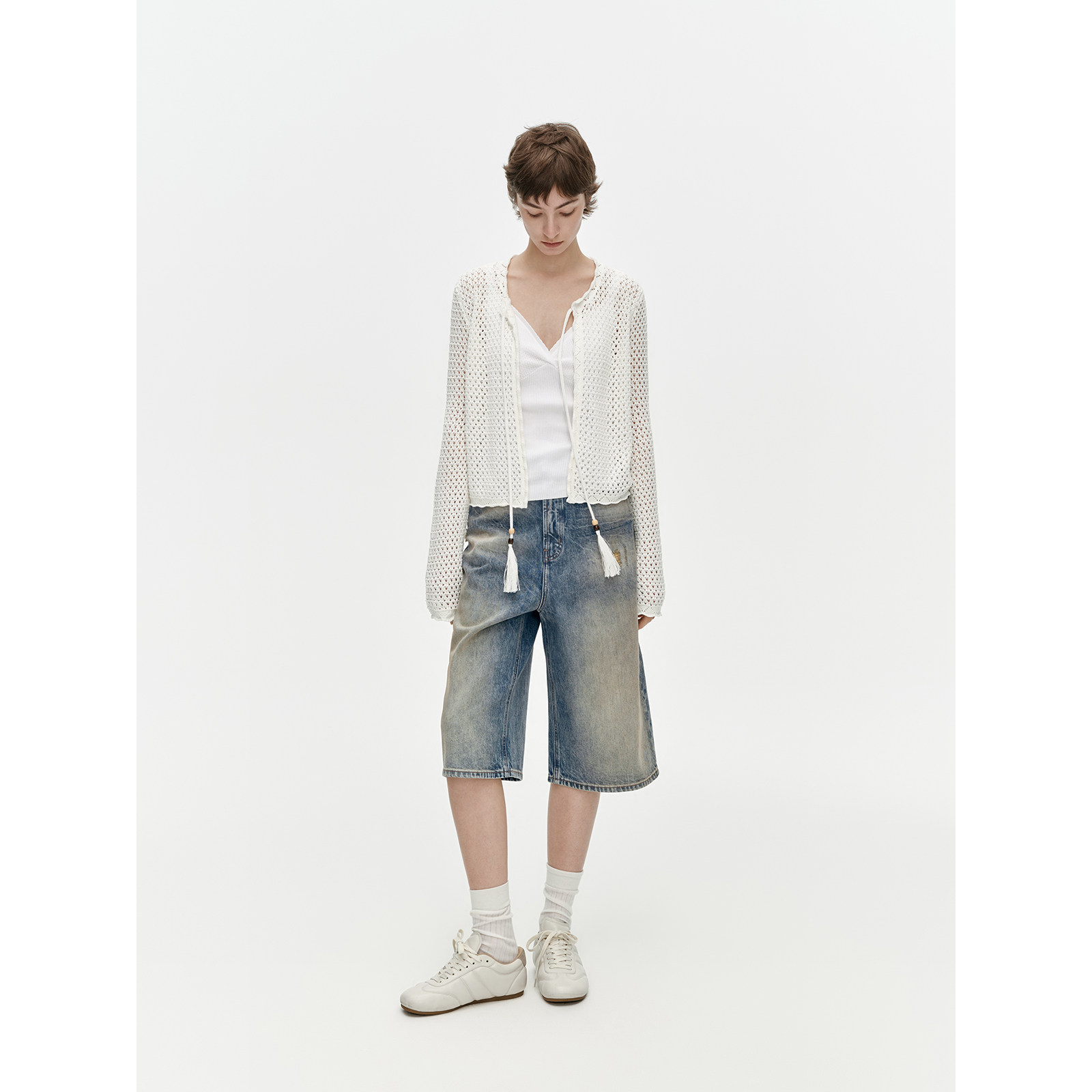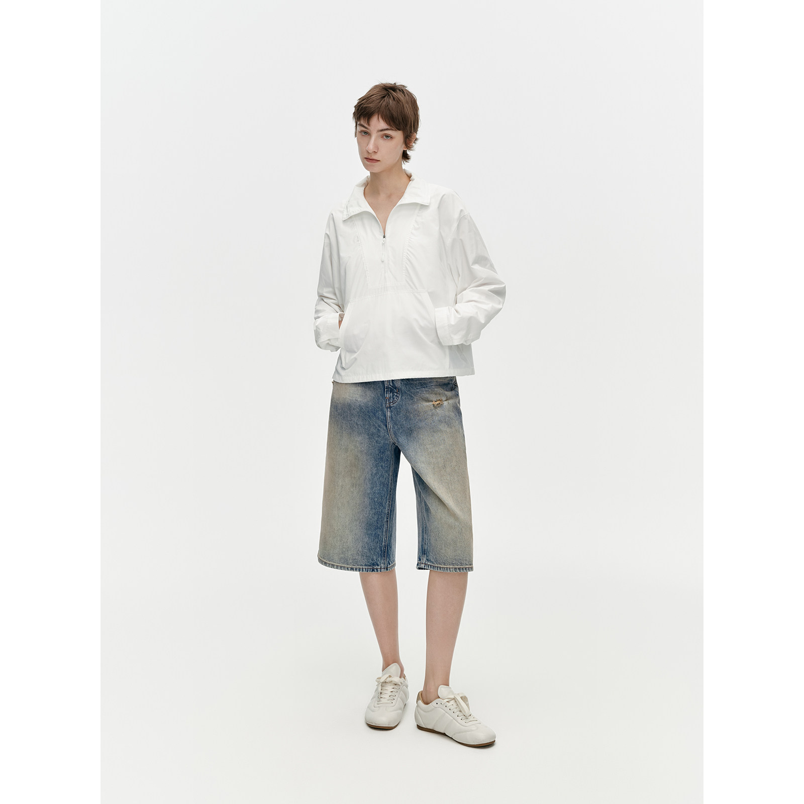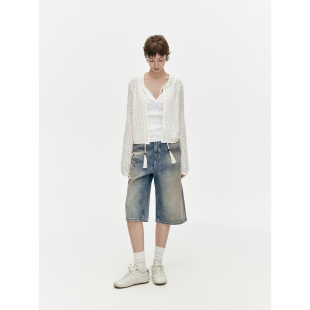 女春夏直筒阔腿中裤 100棉渐变磨白破洞6分牛仔裤 旧港 华吉言