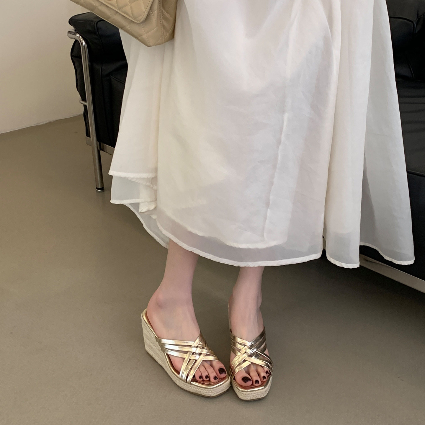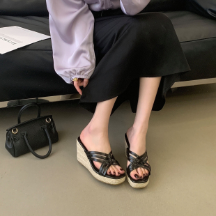 女夏外穿小个子增高露趾高跟鞋 麻绳草编厚底凉鞋 2026新款 坡跟拖鞋