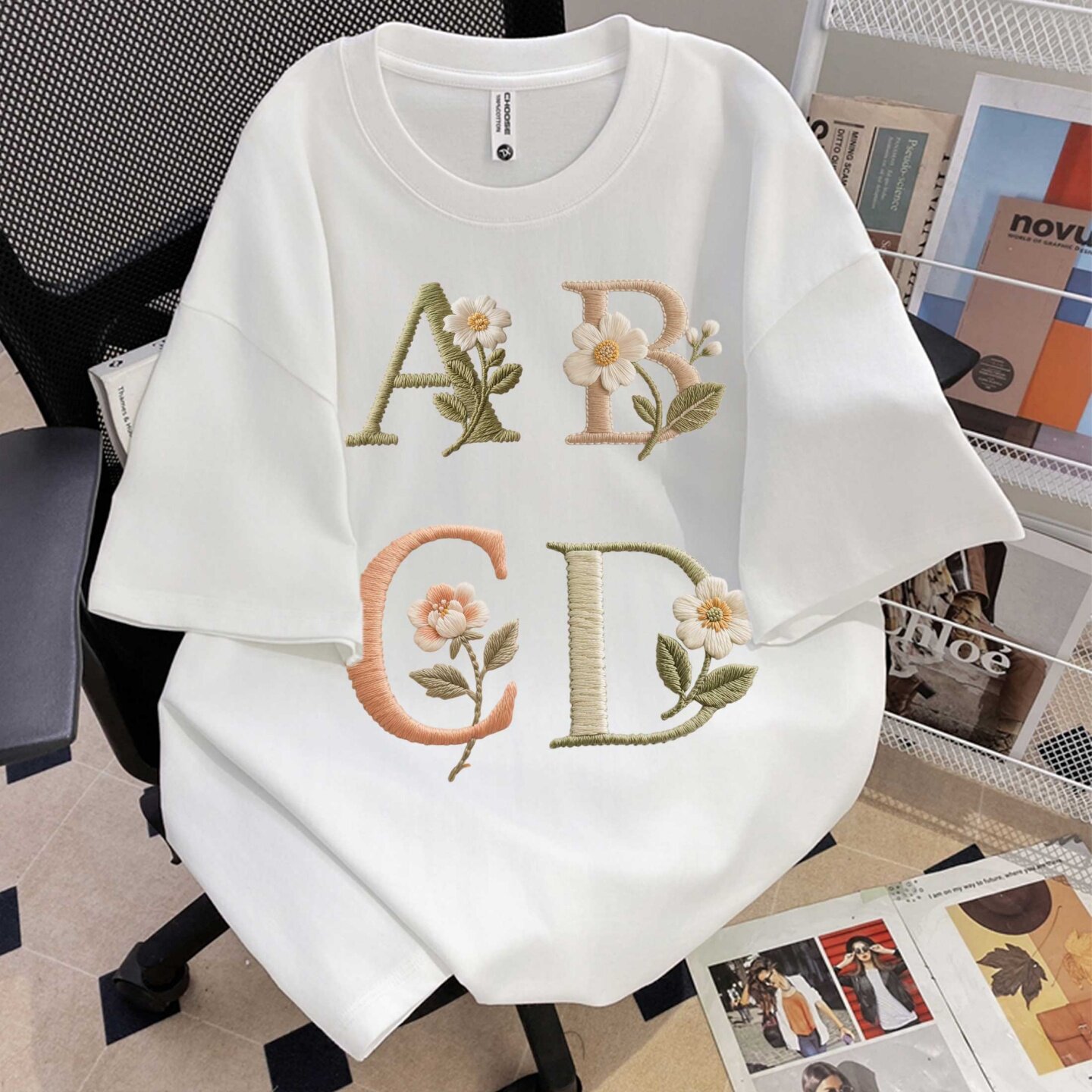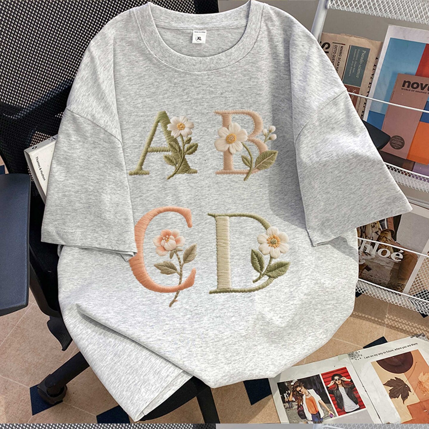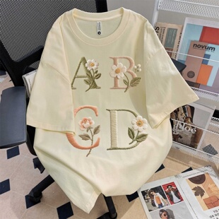 新纯棉复古花卉字母ABCD印花T恤男女宽松黑色纯棉情侣款 上衣 短袖