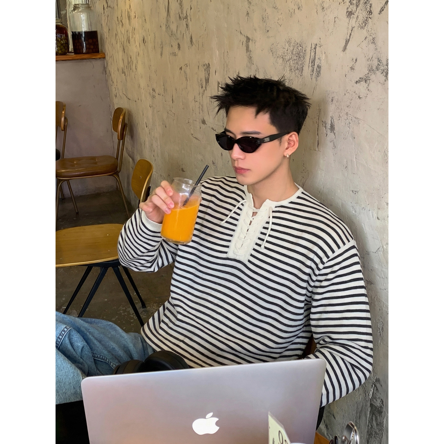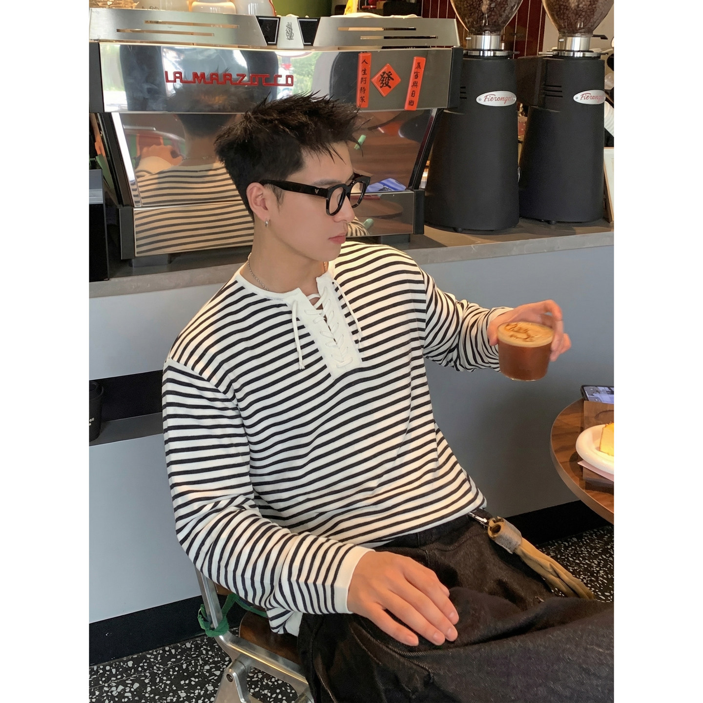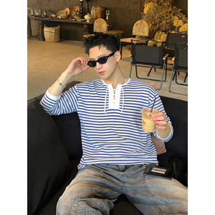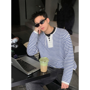T恤男日系cityboy风亨利领宽松上衣潮 复古条纹系带长袖 PLTH 美式