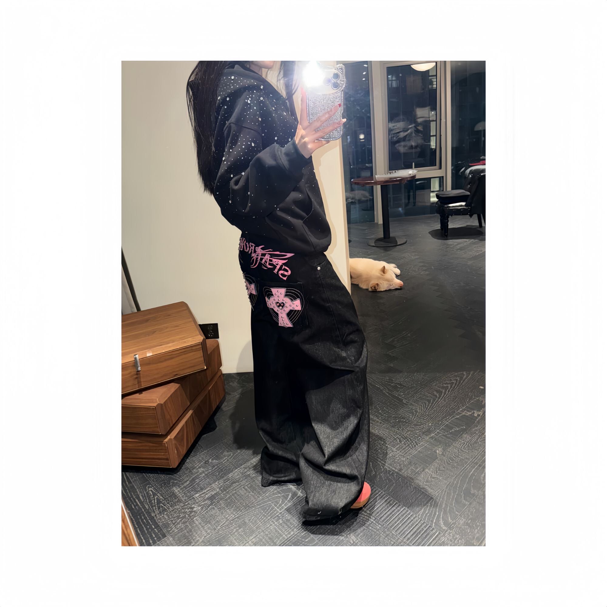 复古原牛铆钉百搭直筒阔腿宽松牛仔裤 美式 粉心铆钉 AMER