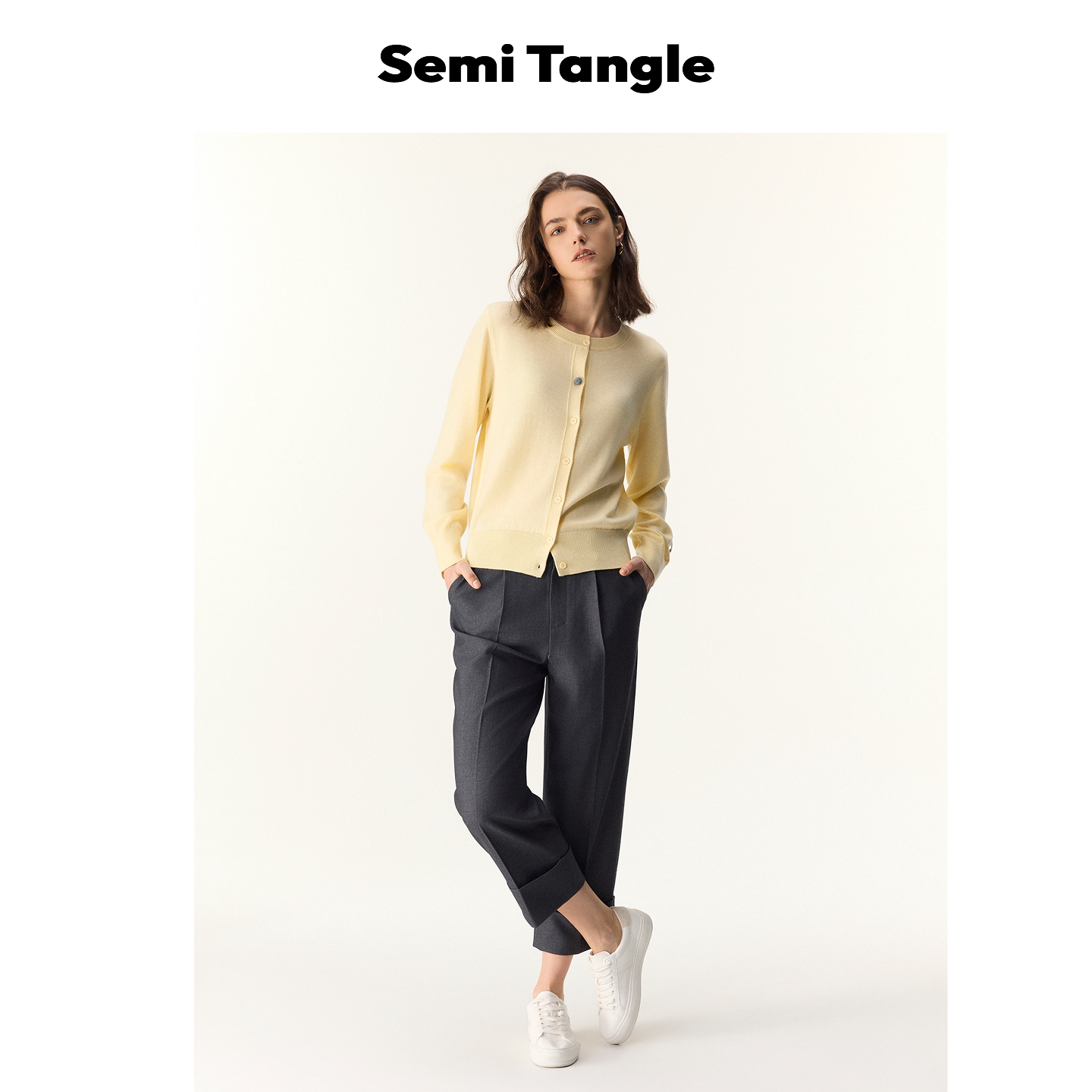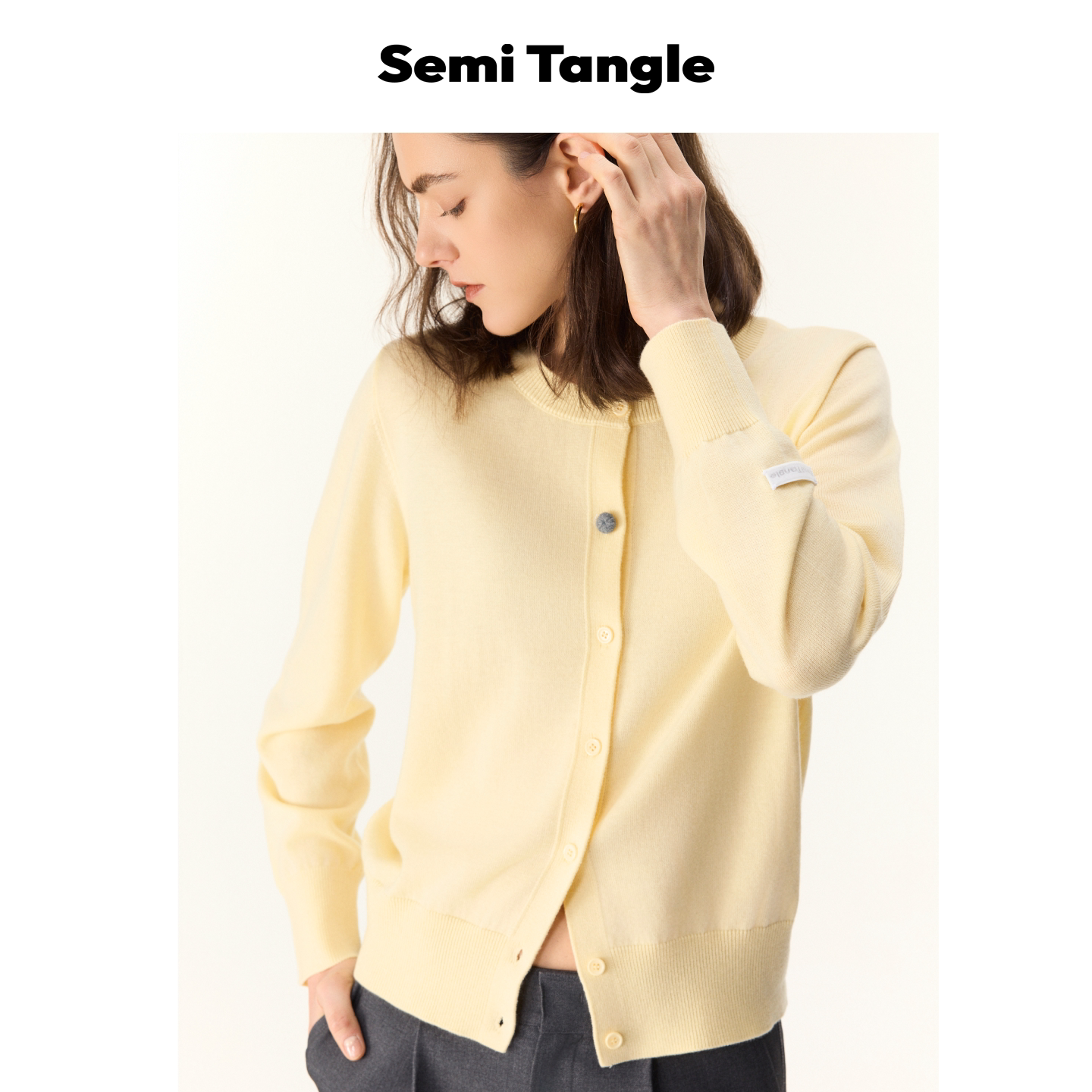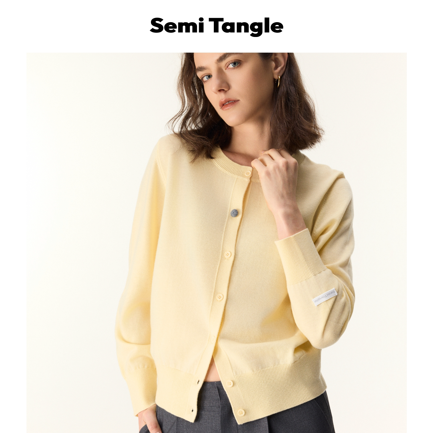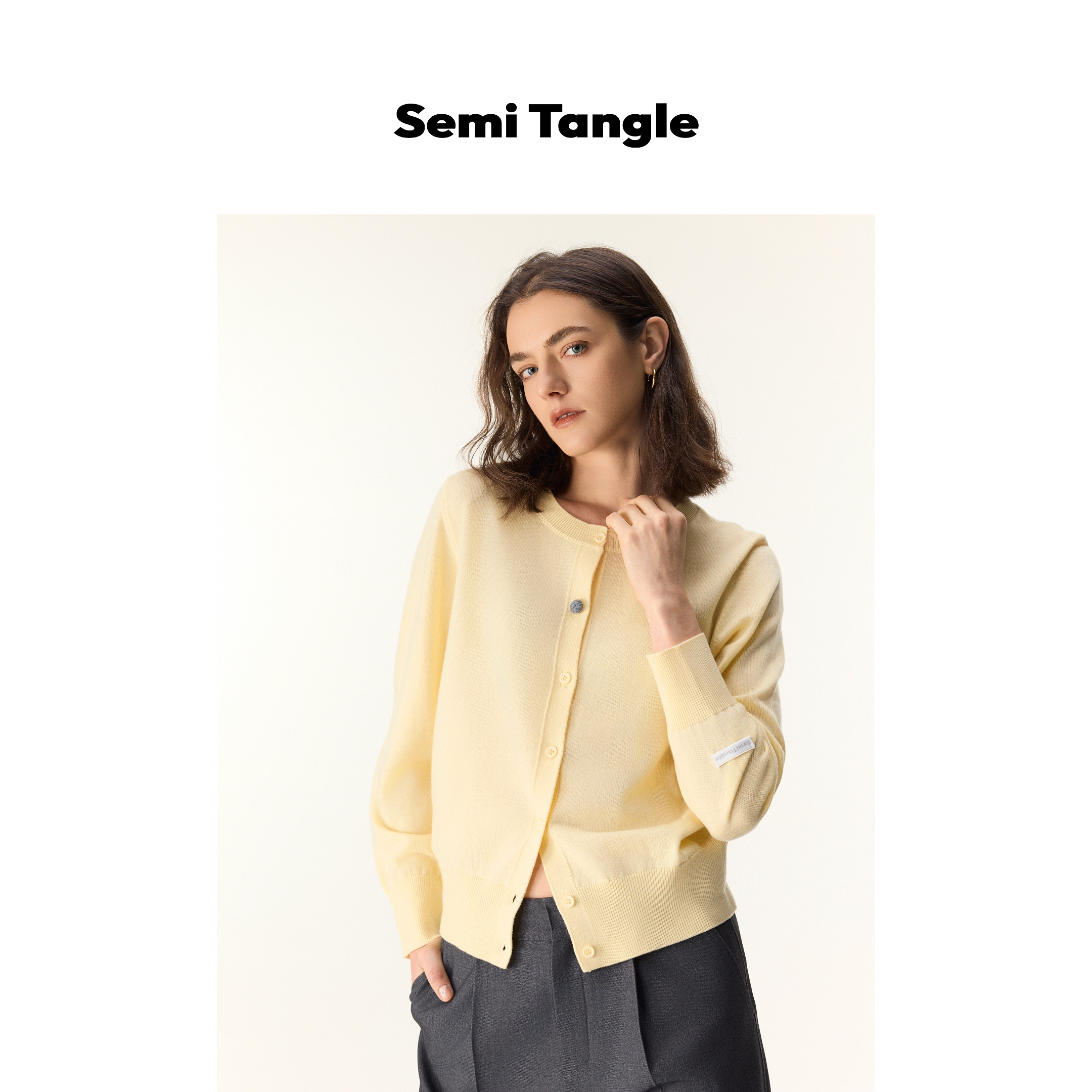 上衣 」羊毛混纺撞色纽扣浅色系嫩黄色开衫 Semi Tangle「新品