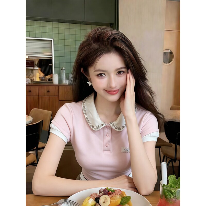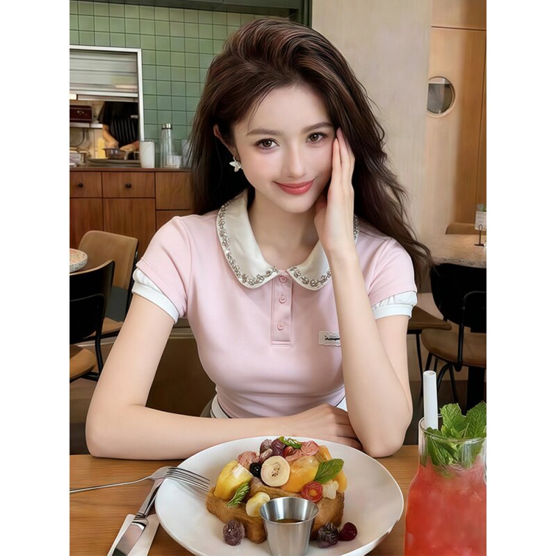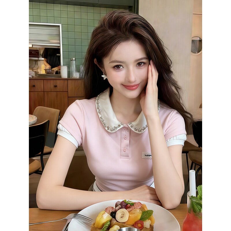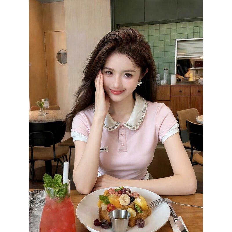 t恤女高级感独特正肩上衣 余单韩系甜美风娃娃领短袖 奥特莱斯 特价