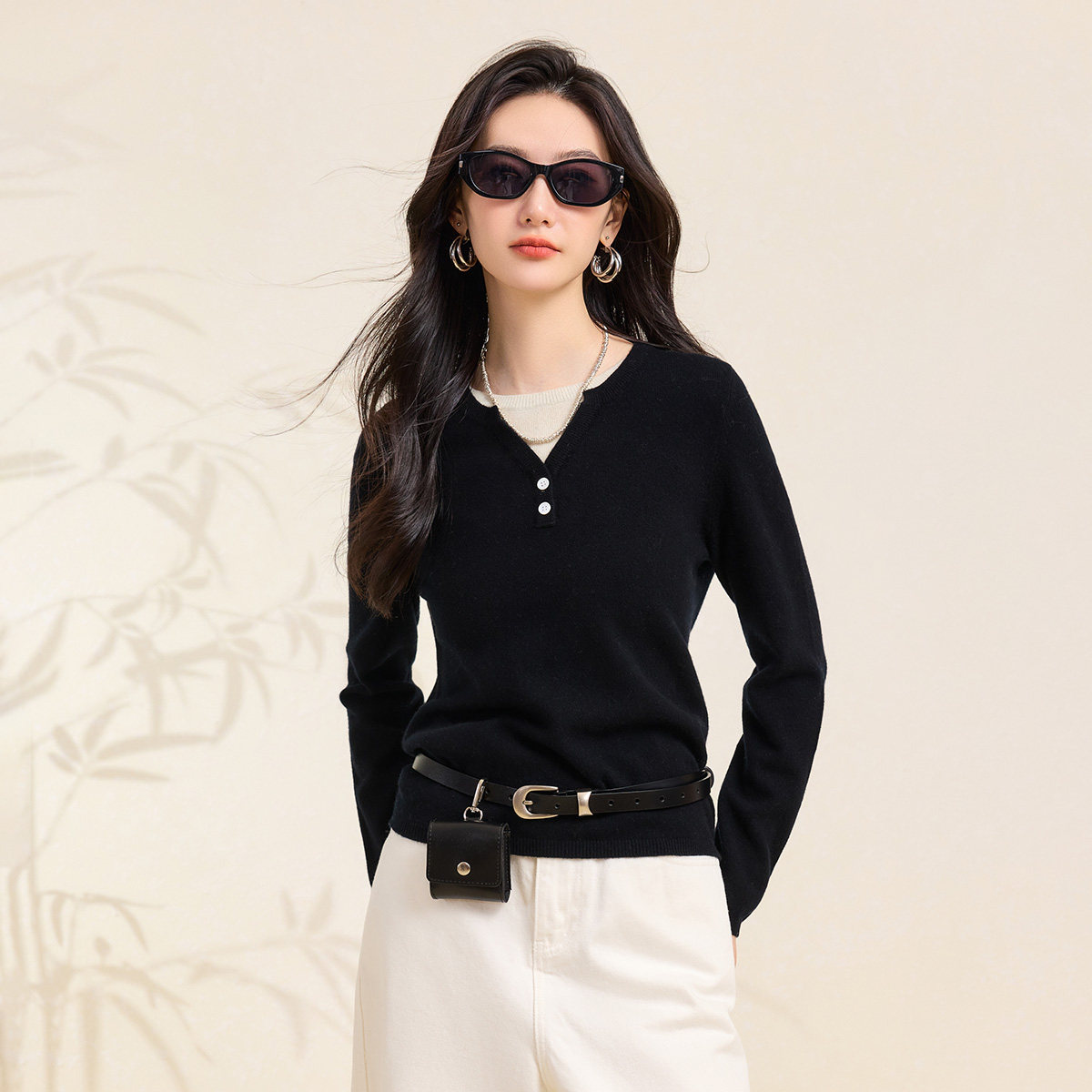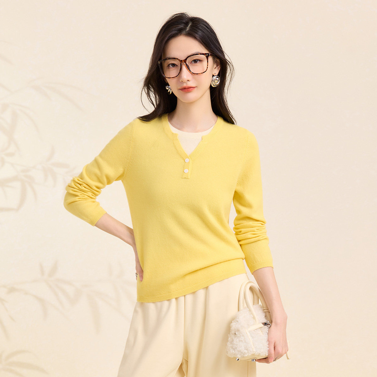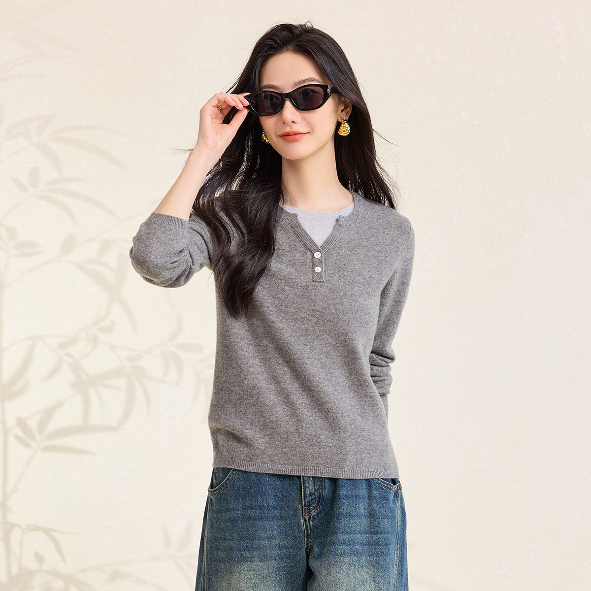 女士针织衫 春竹早春新款 100%羊毛圆领合体假两件长袖