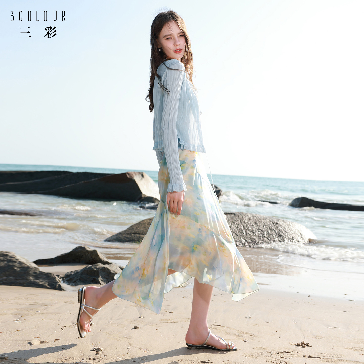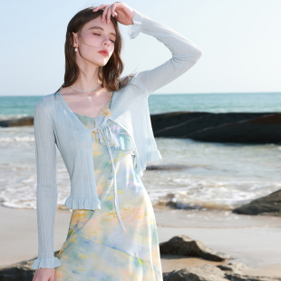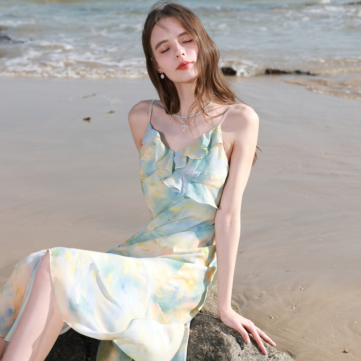 荷叶边V领A字连衣裙吊带裙印花雪纺裙M 法式 三彩2026春季 新款