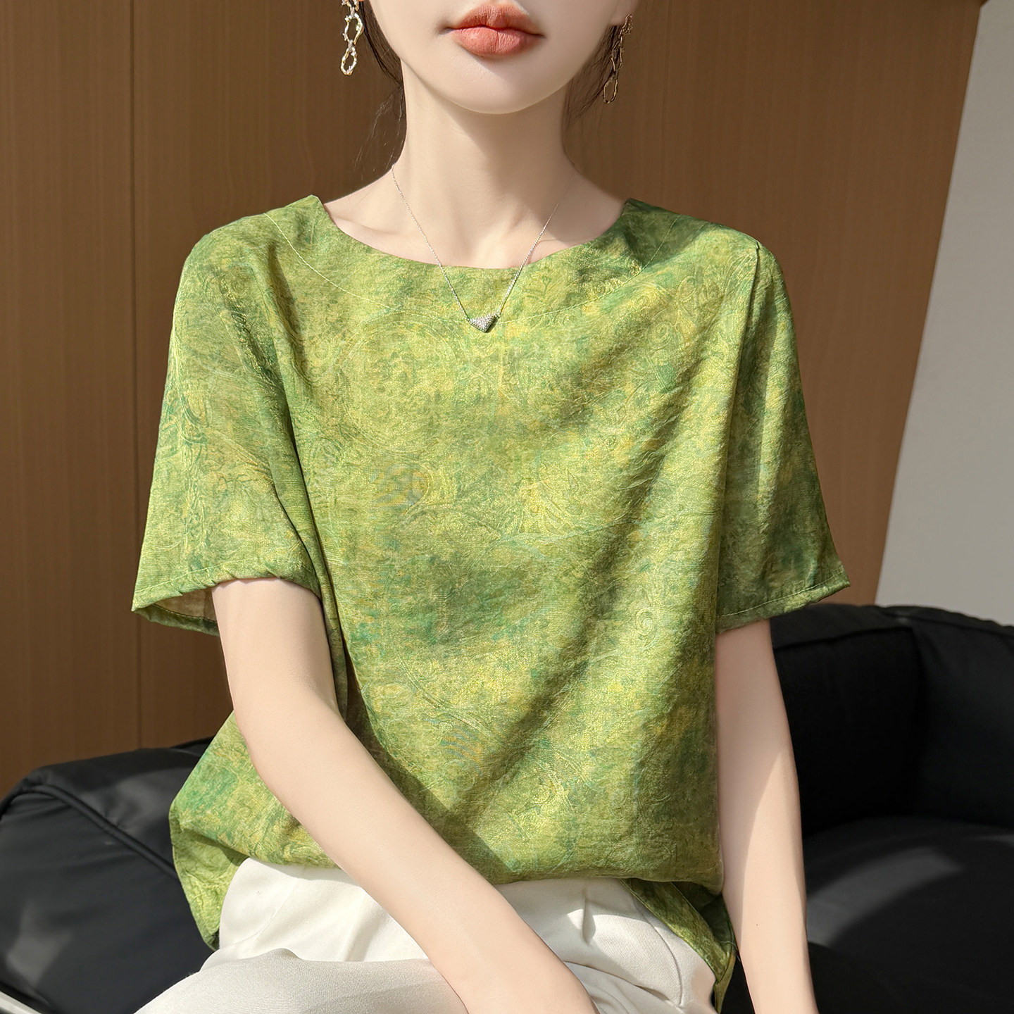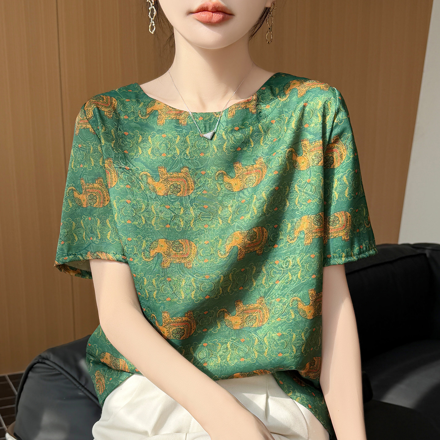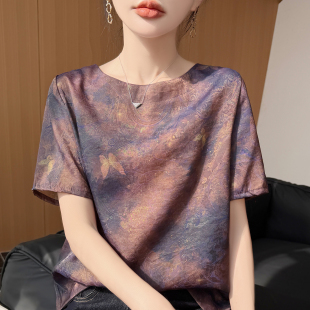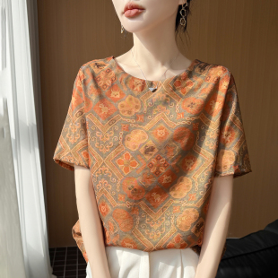 上衣宽松醋酸T恤打底 女圆领缎面真丝半袖 新中式 复古拼色印花短袖