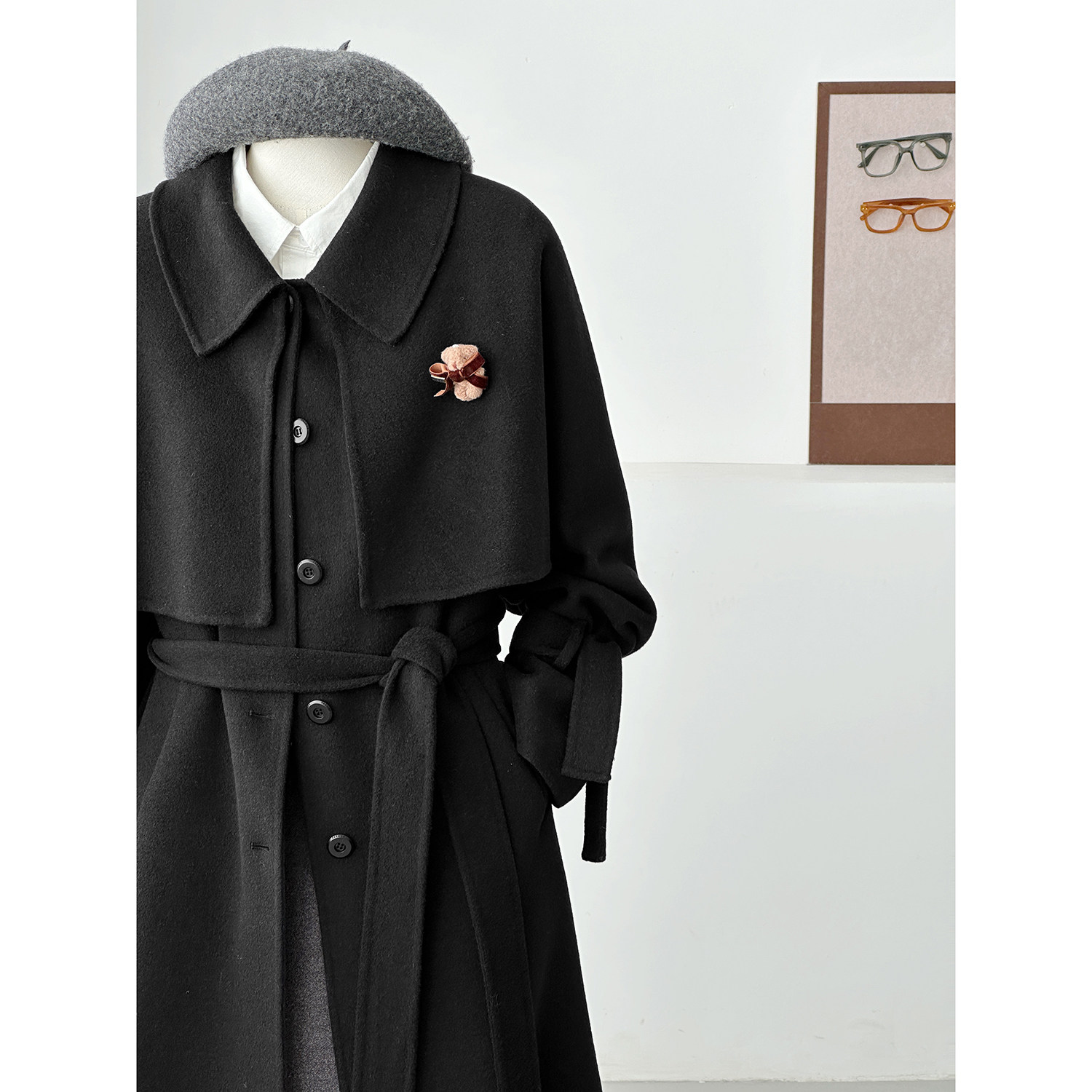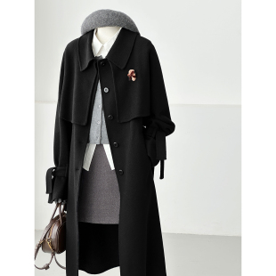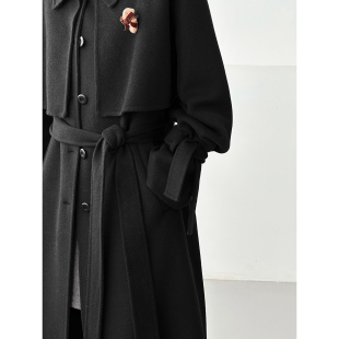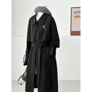 满减老钱风黑色长款 领系带收腰通勤外套HL146 毛呢大衣女西装