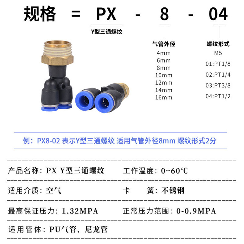 三通气管接头快速气动接头Y型螺纹快插接头px4 10mm