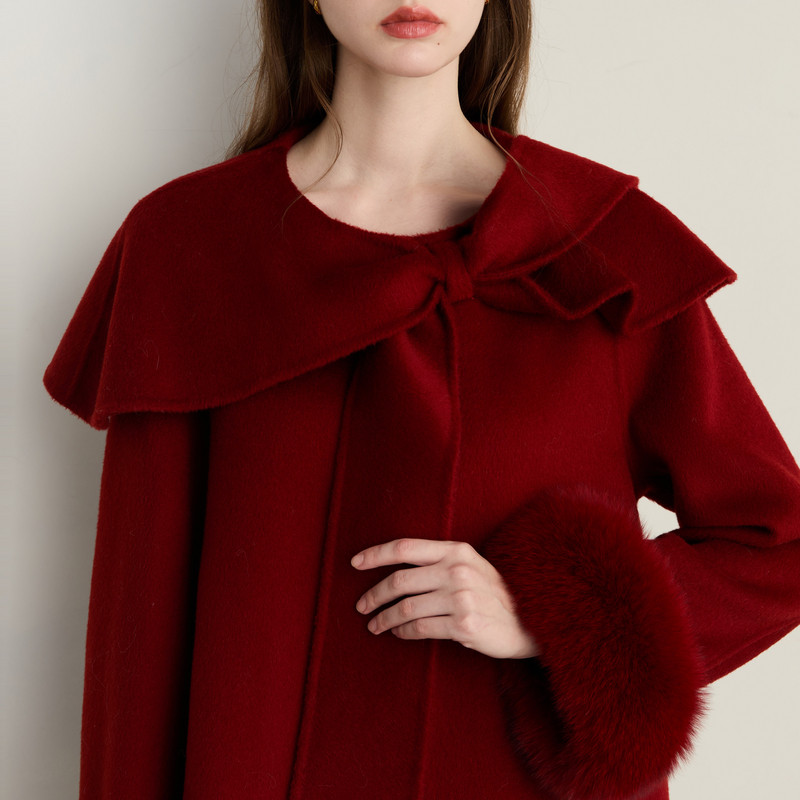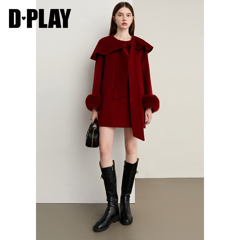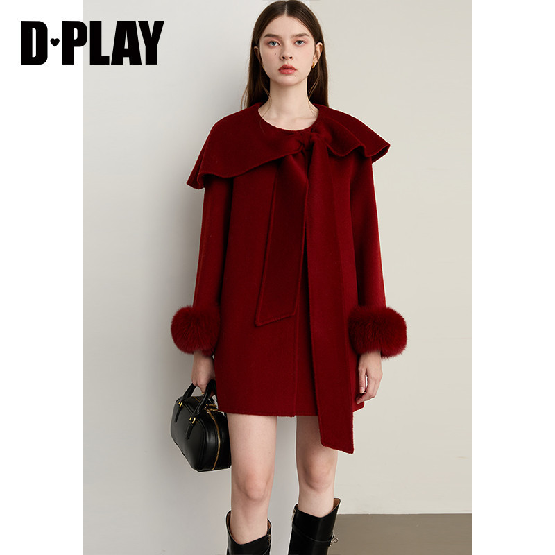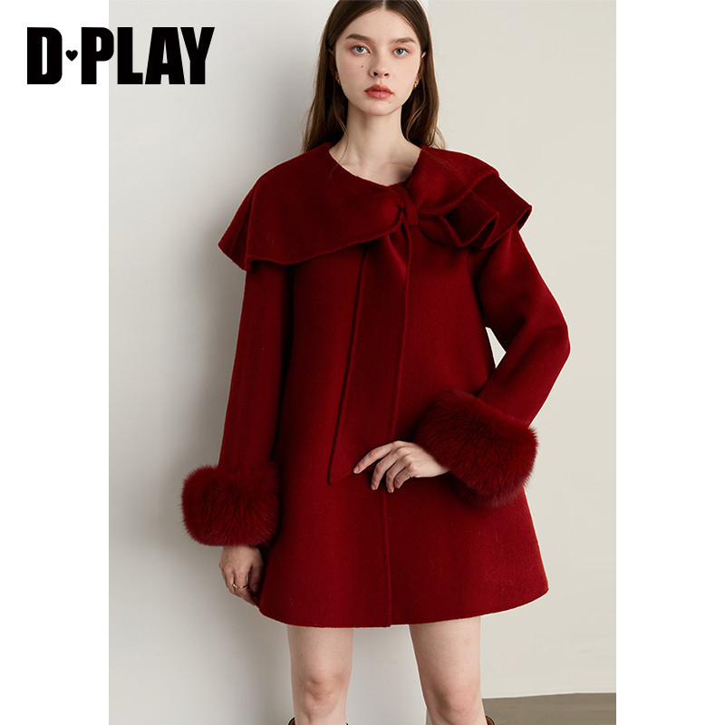 DPLAY100羊毛红色双面呢子大衣狐狸毛小个子冬季 上衣女新外套