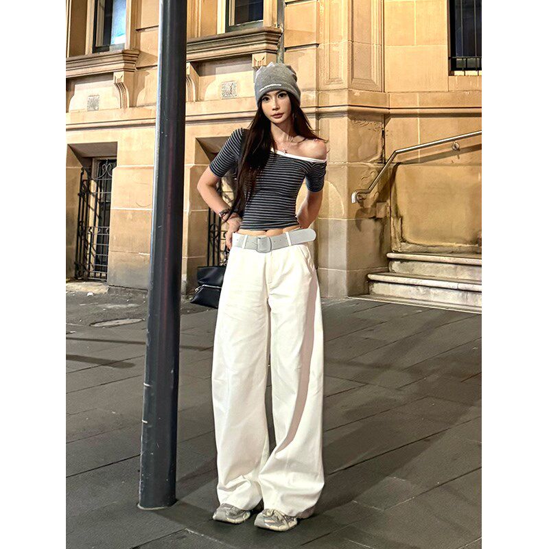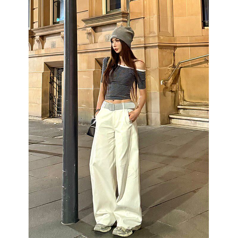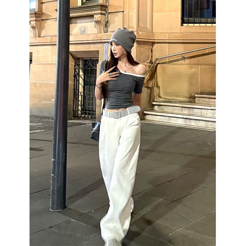 设计感辣妹紧身显瘦露肩上衣 t恤女夏季 李婉君 撞色条纹斜肩短袖