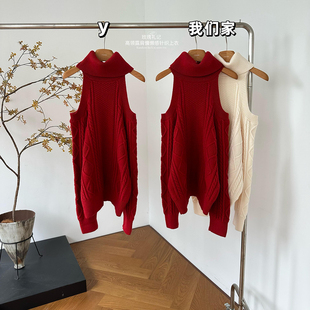 柒月末 高领露肩毛衣女冬慵懒感圣诞红色针织上衣 玫瑰礼记