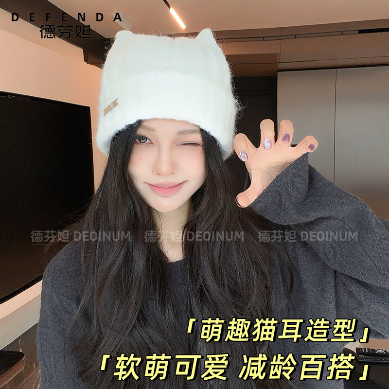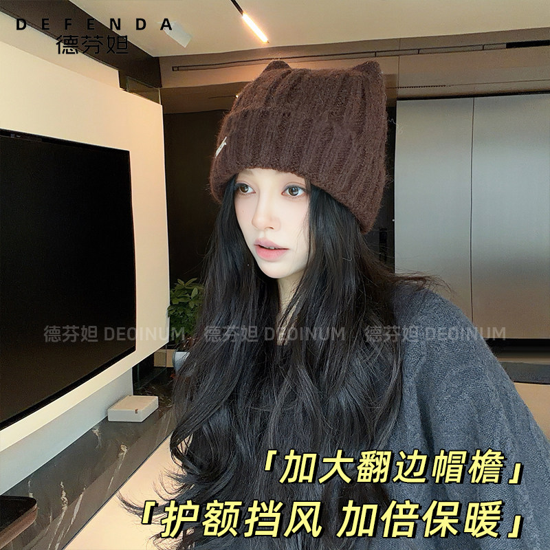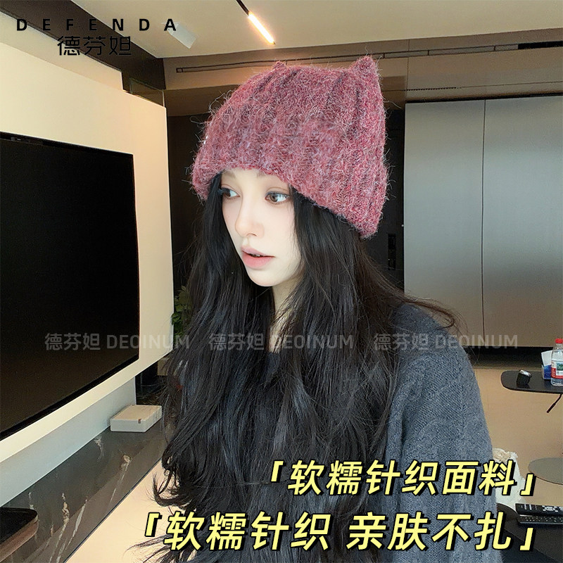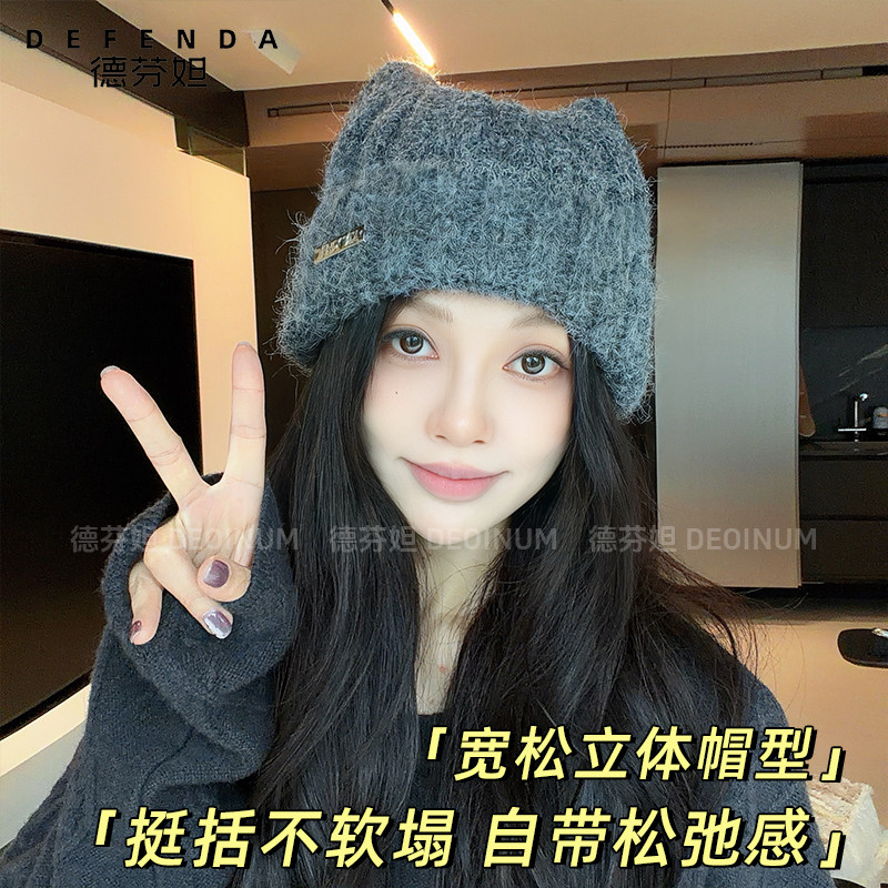 德芬妲猫耳针织帽女秋冬新款 保暖加厚毛线帽可爱减龄显脸小包头帽