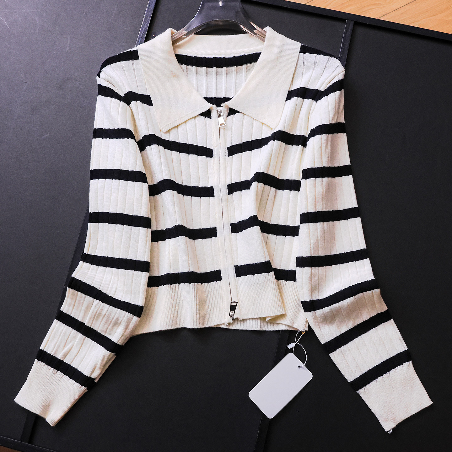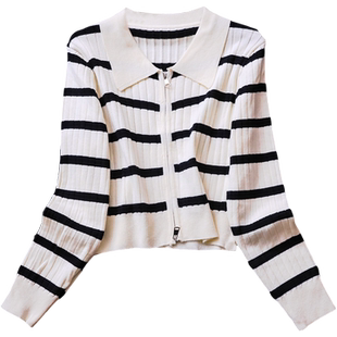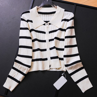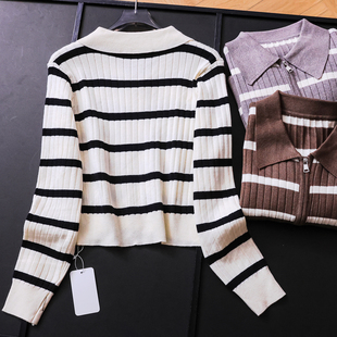 M353 百搭女针织衫 撞色条纹双向拉链门襟显瘦POLO领毛衣开衫 长袖