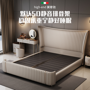 现代轻奢竖纹真皮床羽翼高背头层牛皮金色饰边主卧大户型双人婚床