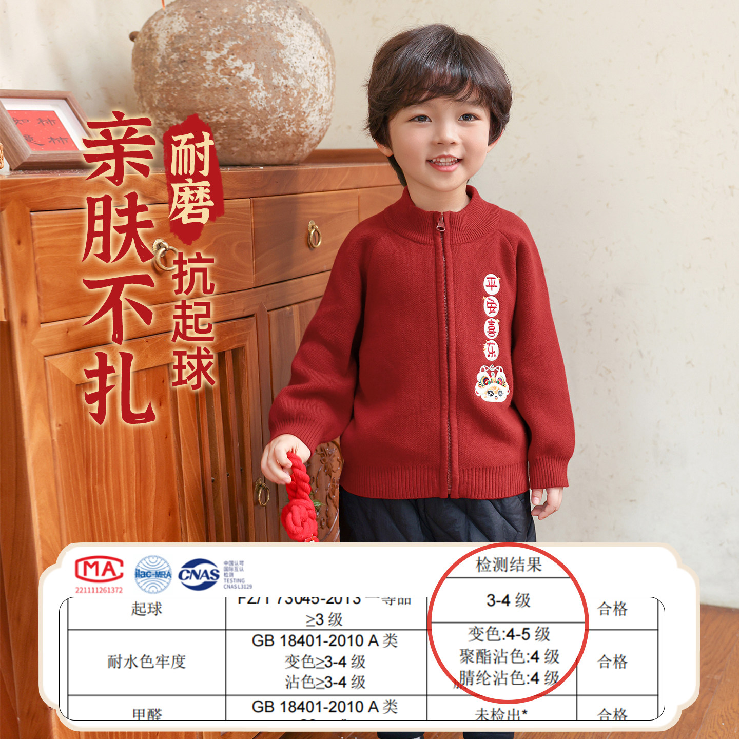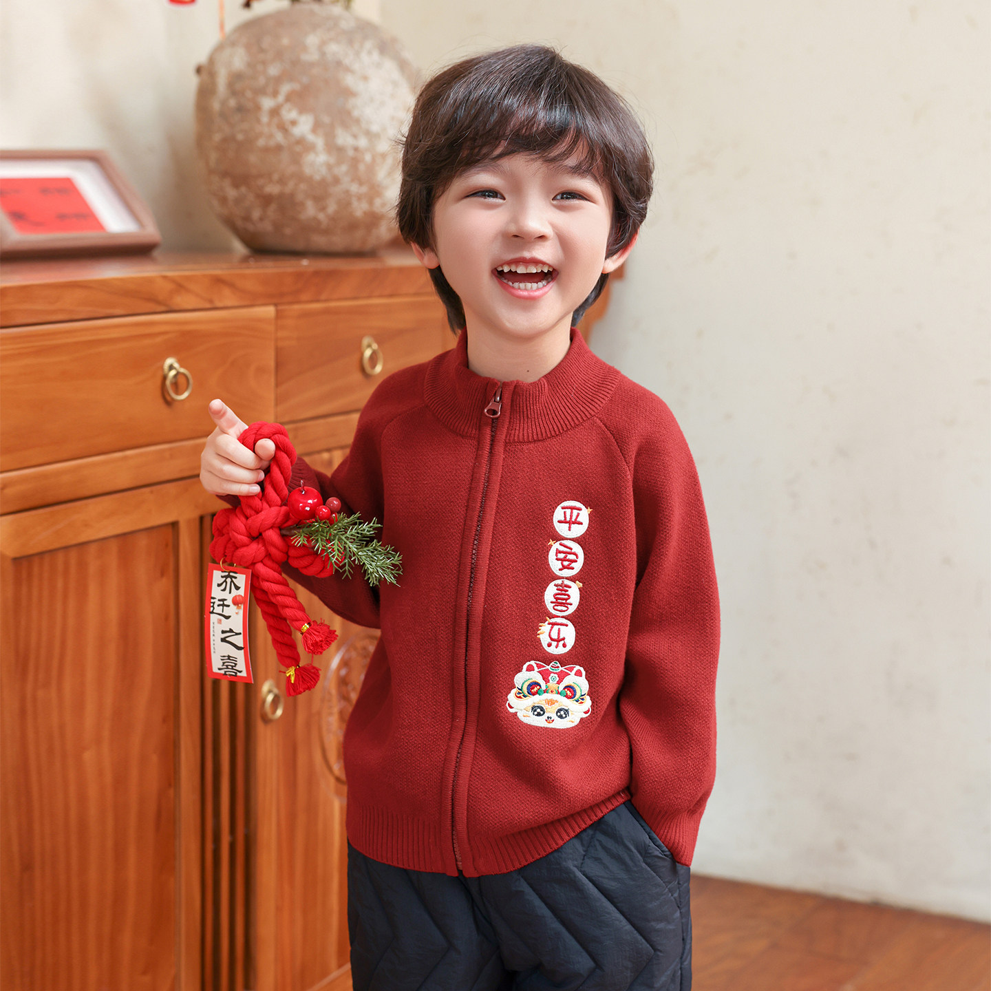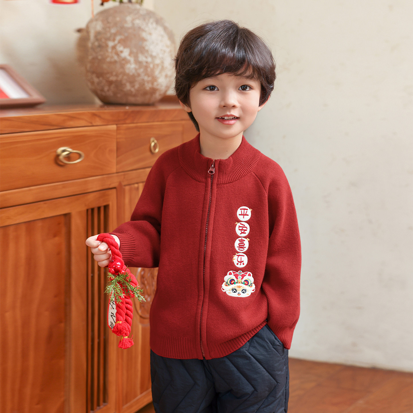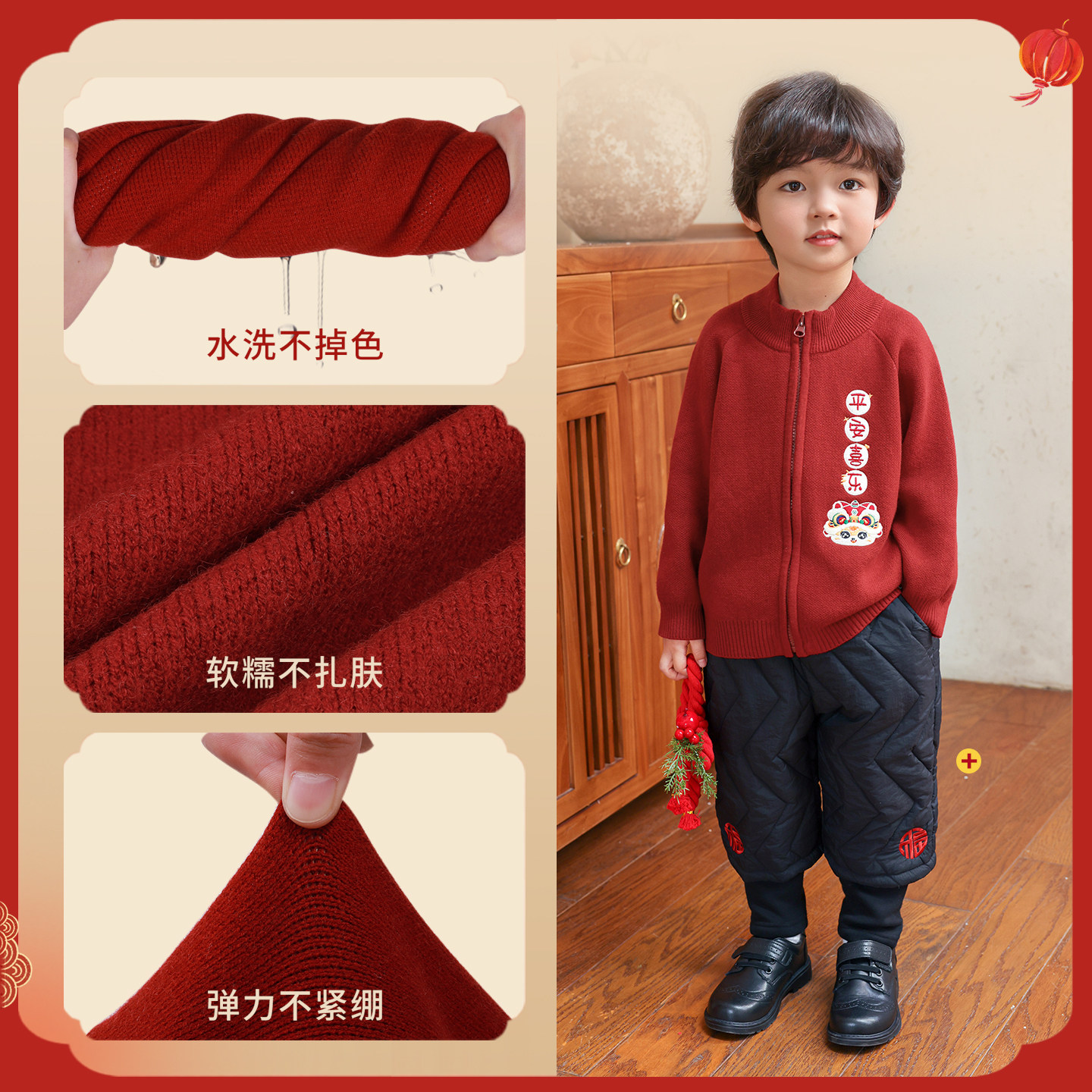 儿童红色毛衣男童毛线衣冬2025新款 纯棉上衣过年喜庆 男孩针织开衫