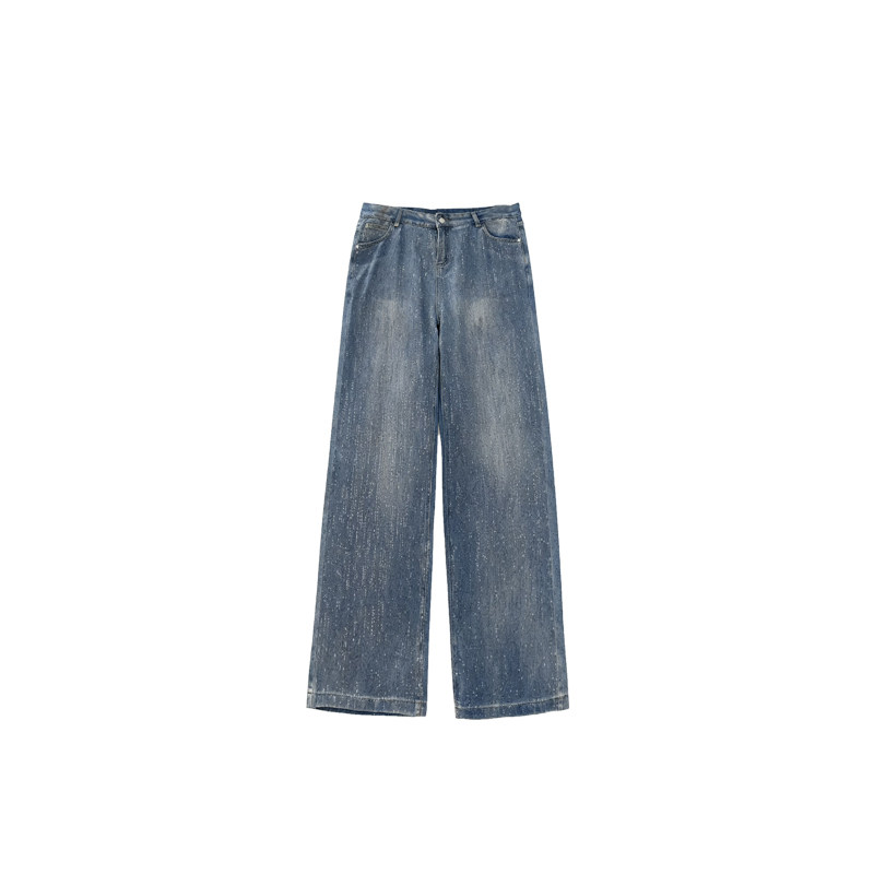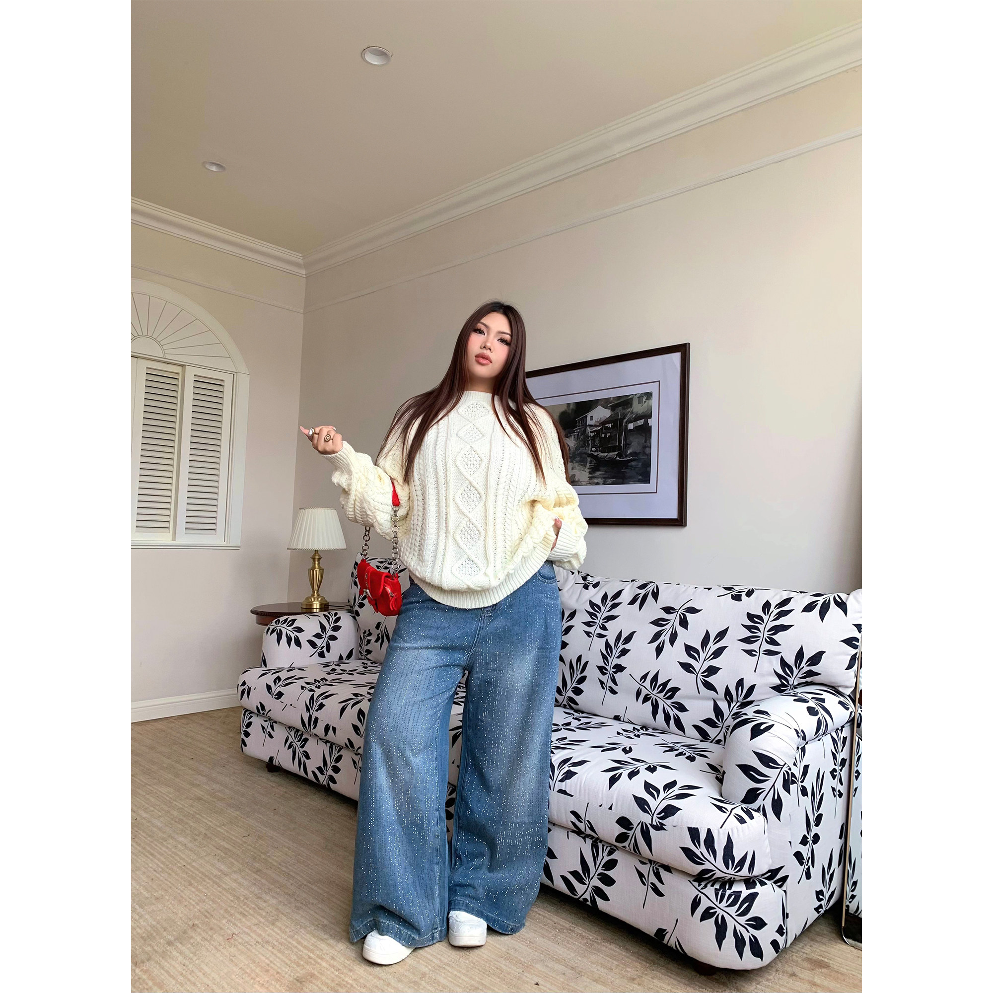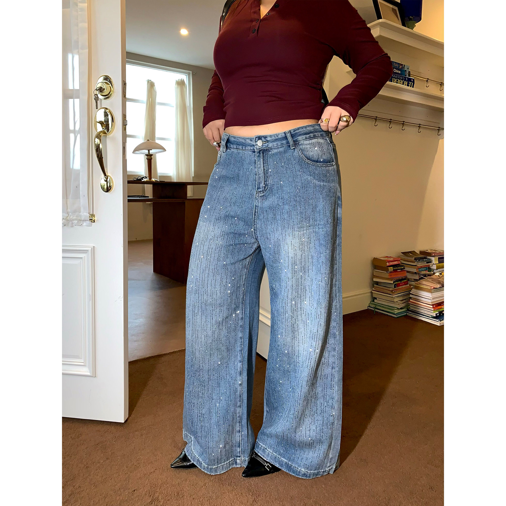 高腰直筒阔腿裤 楠哥微胖mm复古重工满天星烫钻加绒牛仔裤 女秋大码