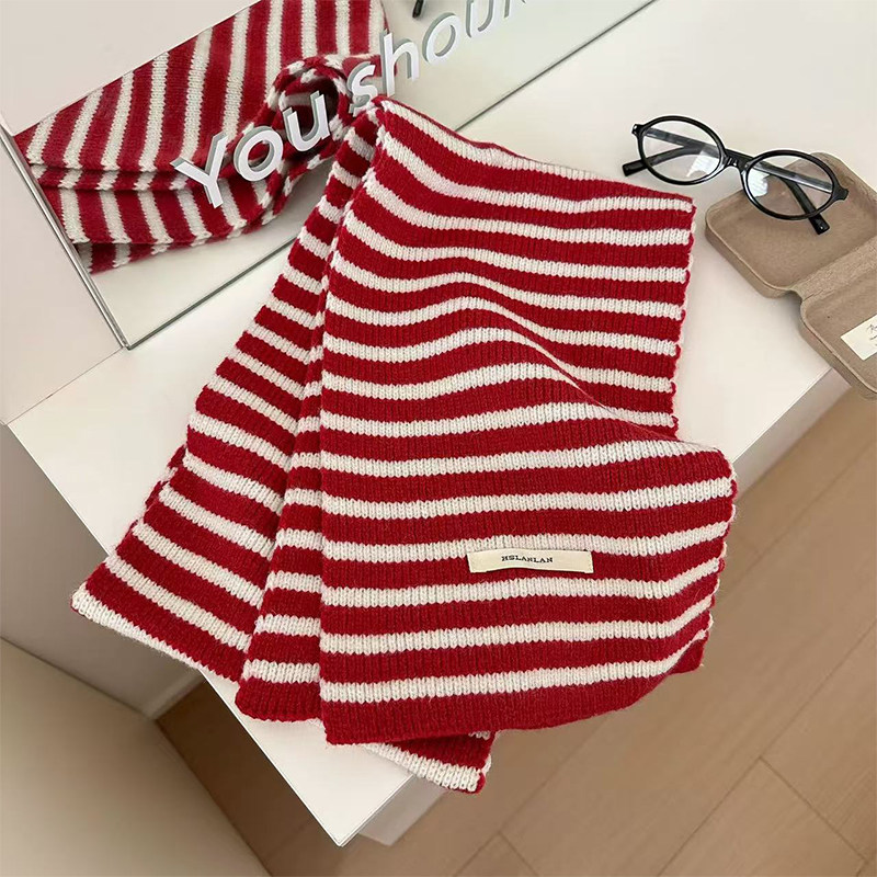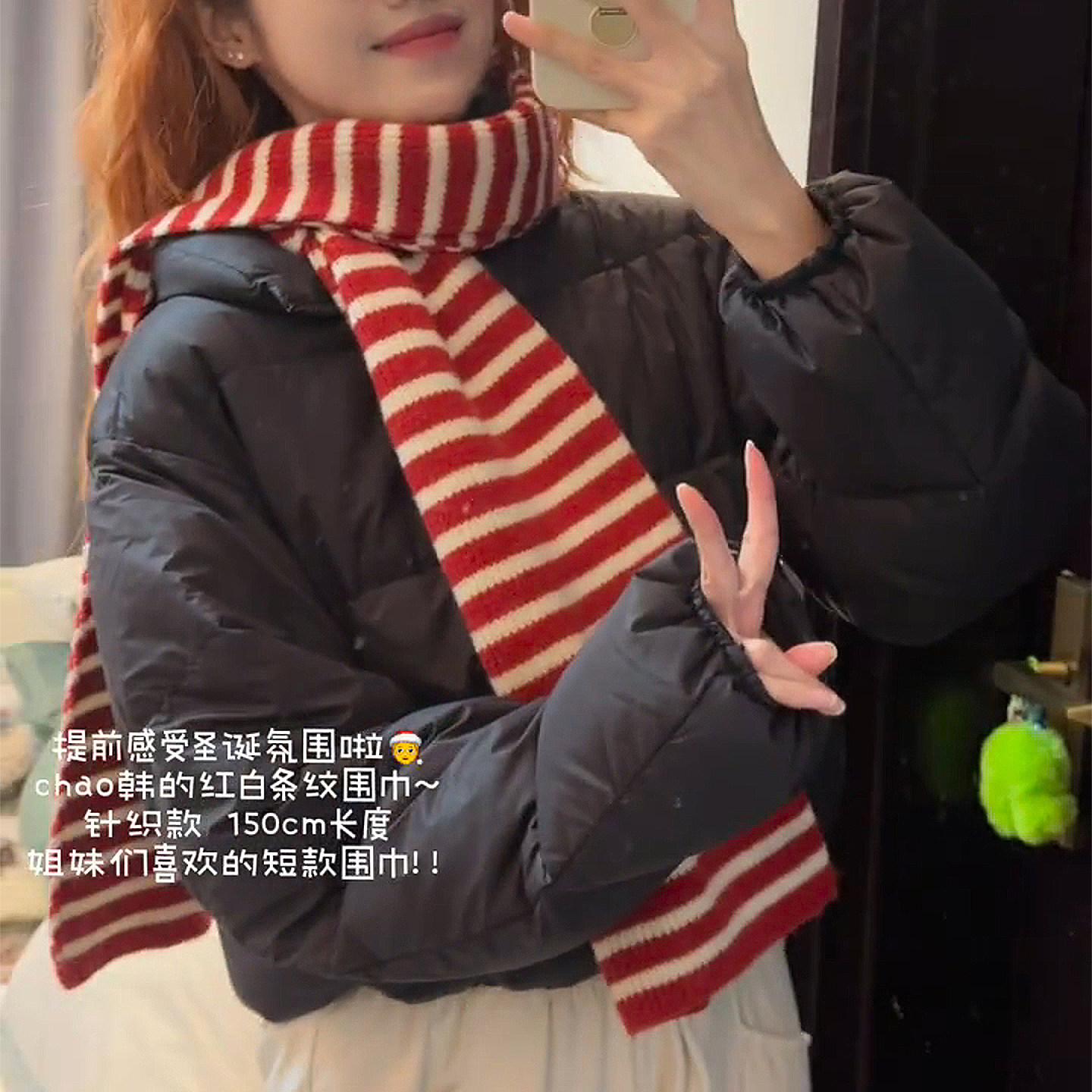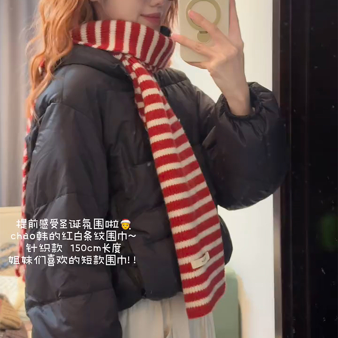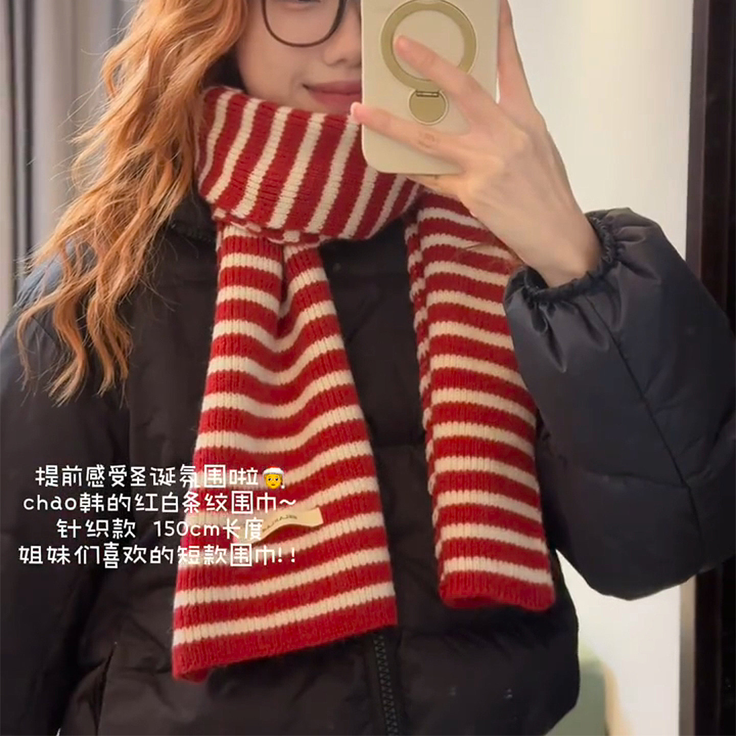 高级感保暖加厚针织围脖 冬季 圣诞新年红色条纹围巾女款 2025新款