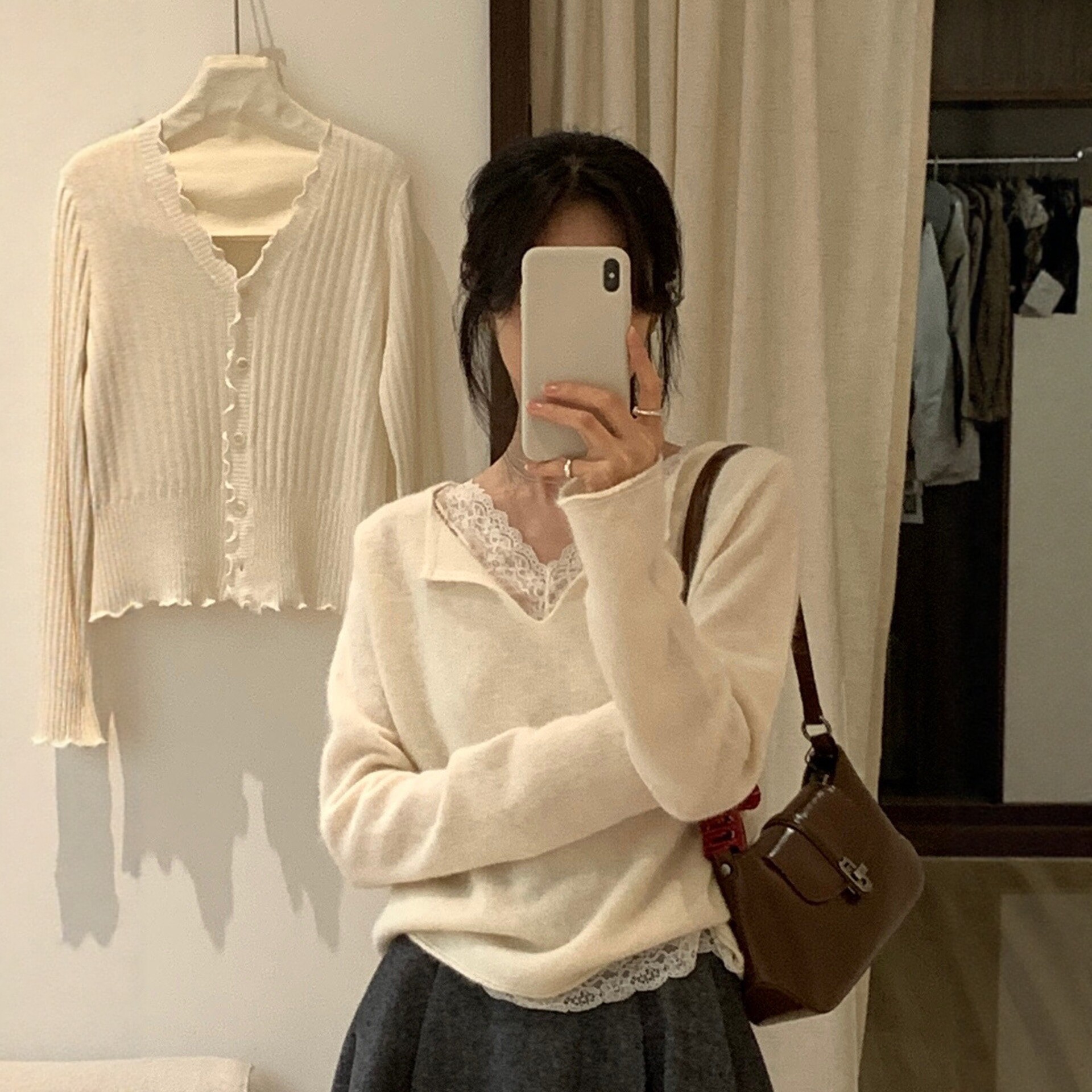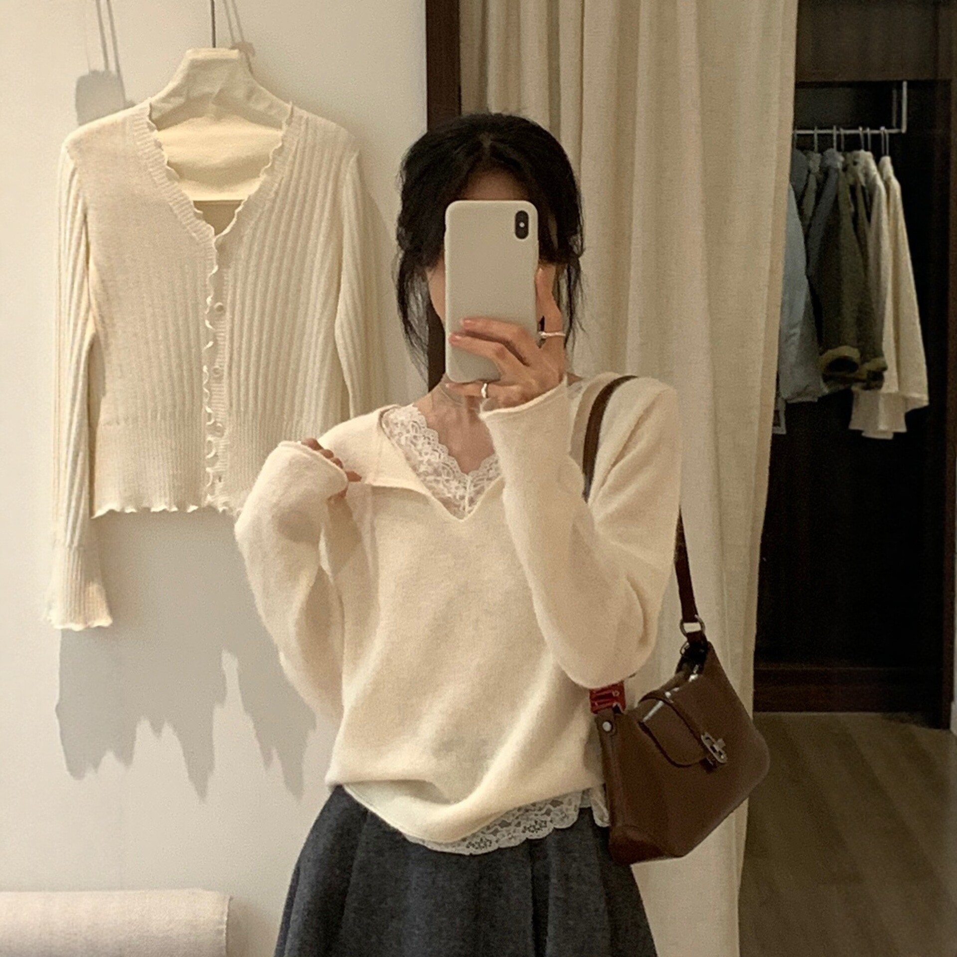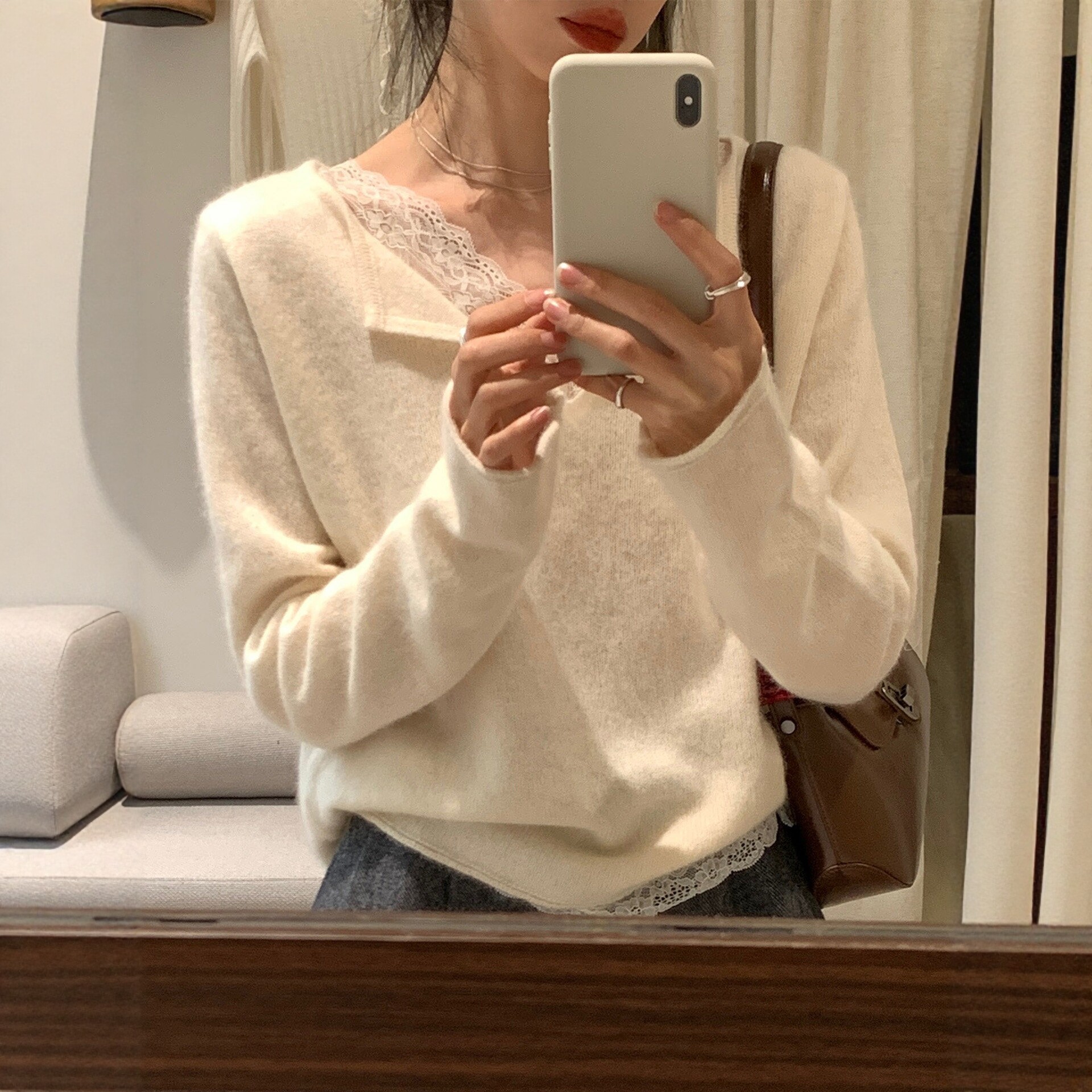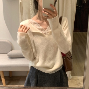 设计感上衣正肩 女秋冬季 白色内搭蕾丝花边拼接v领长袖 针织打底衫
