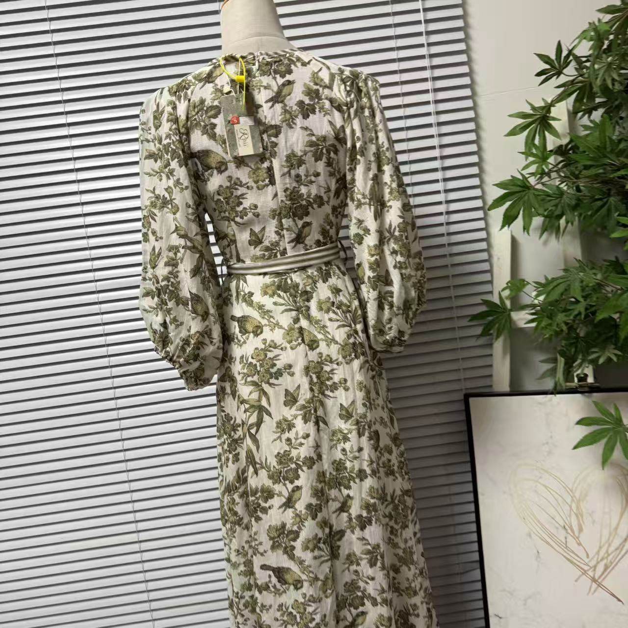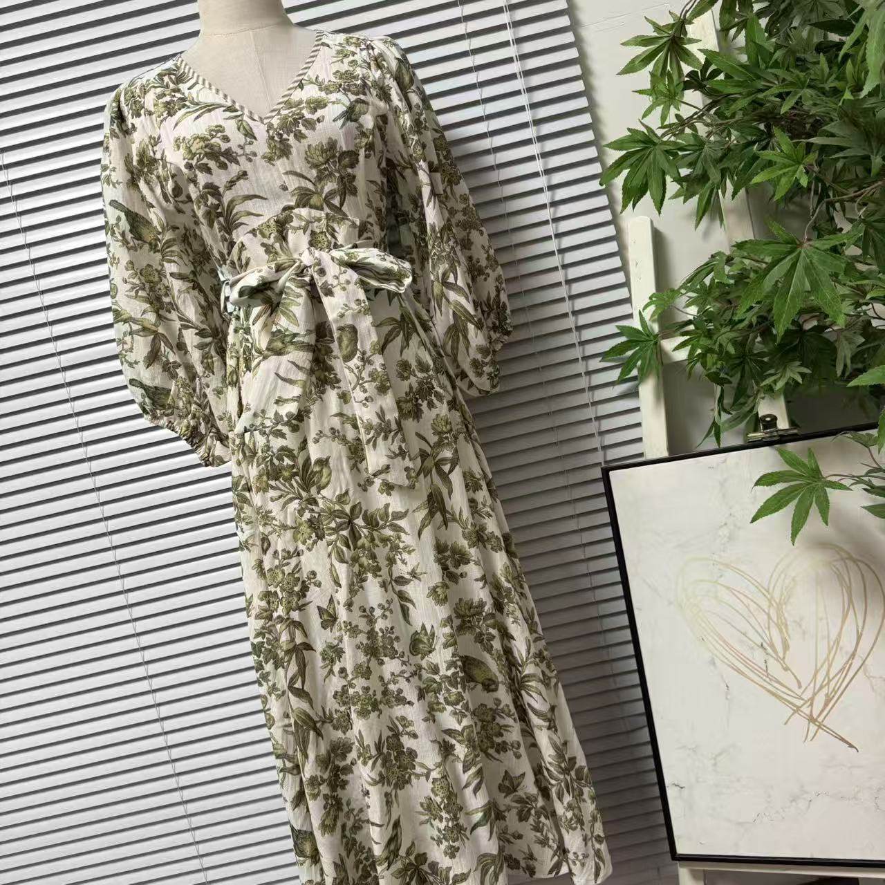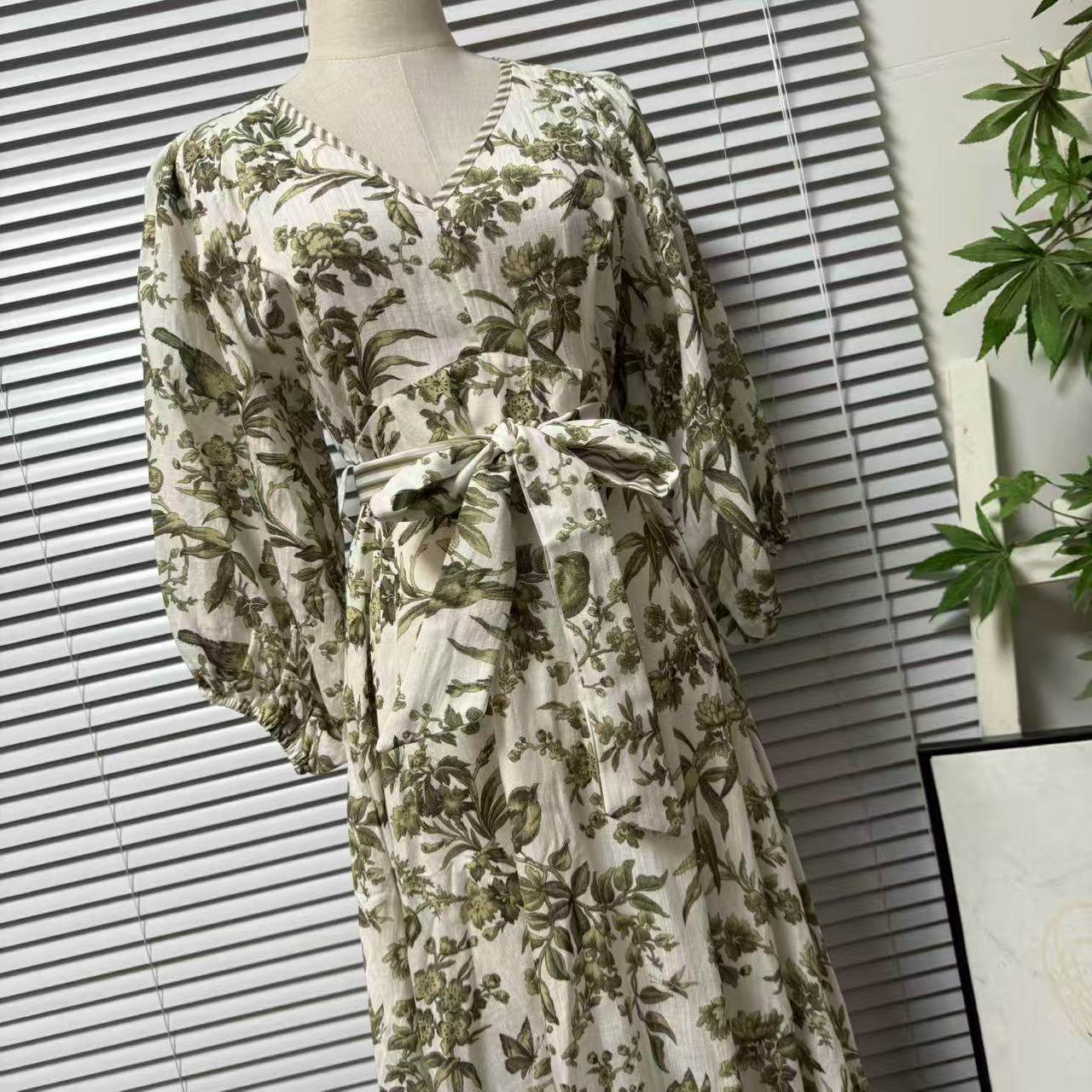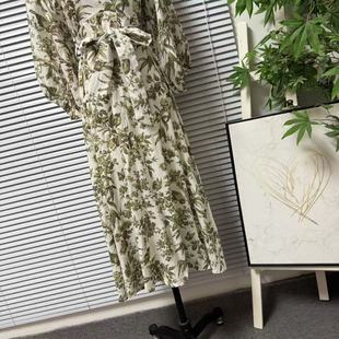 显瘦裙子 收腰系带中长款 1219 9欧美复古亚麻印花连衣裙女V领长袖