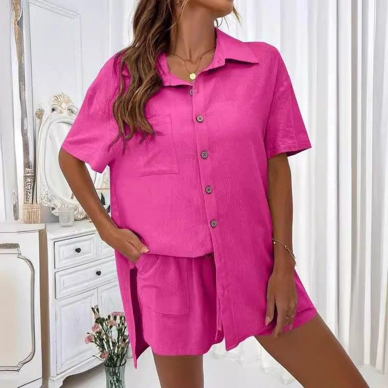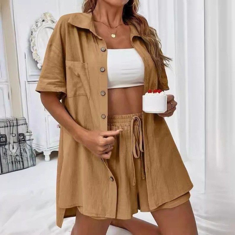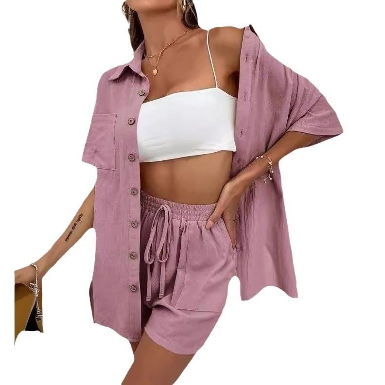 女休闲宽松短袖 跨境速卖通时尚 套装 两件纯色衬衫 单排扣 短裤