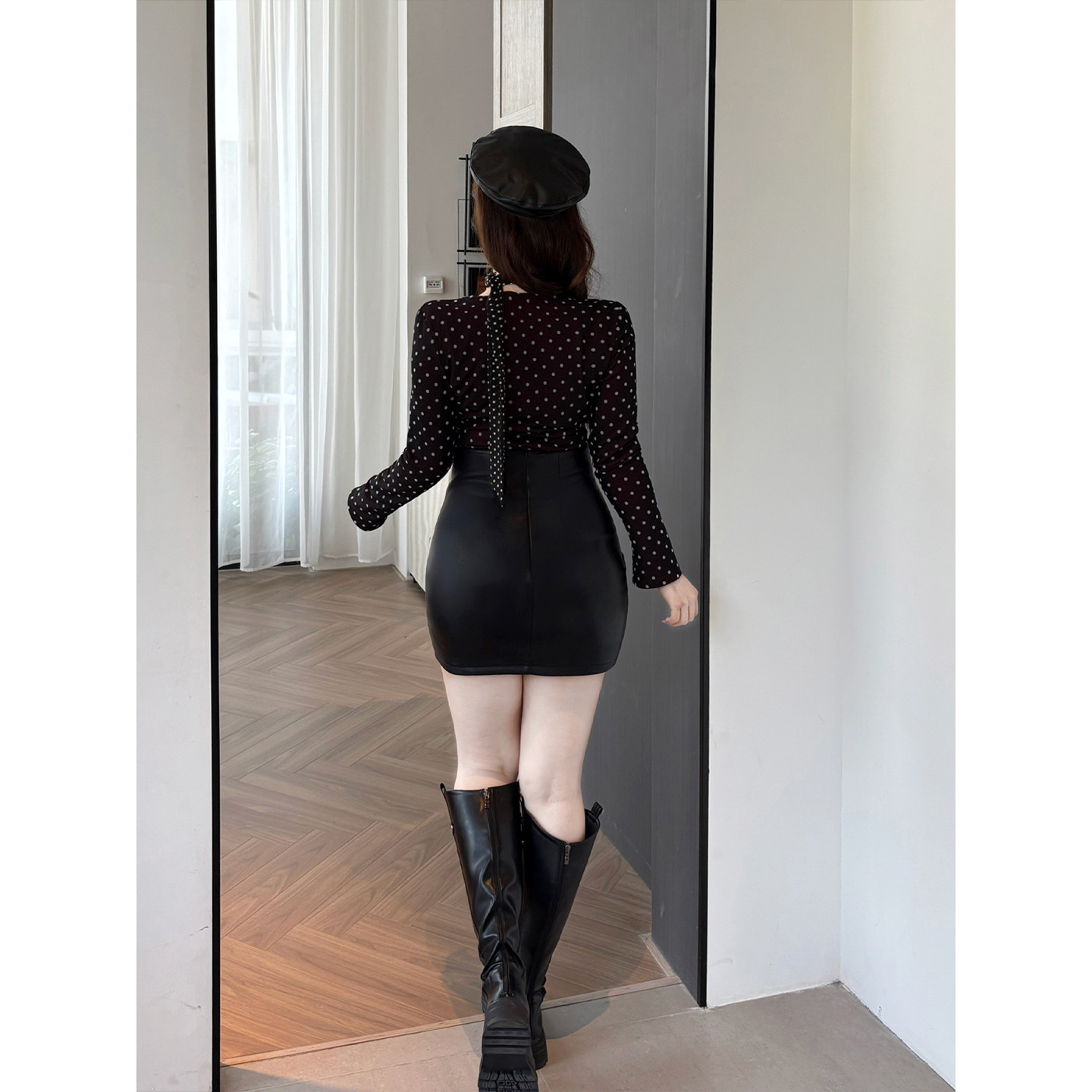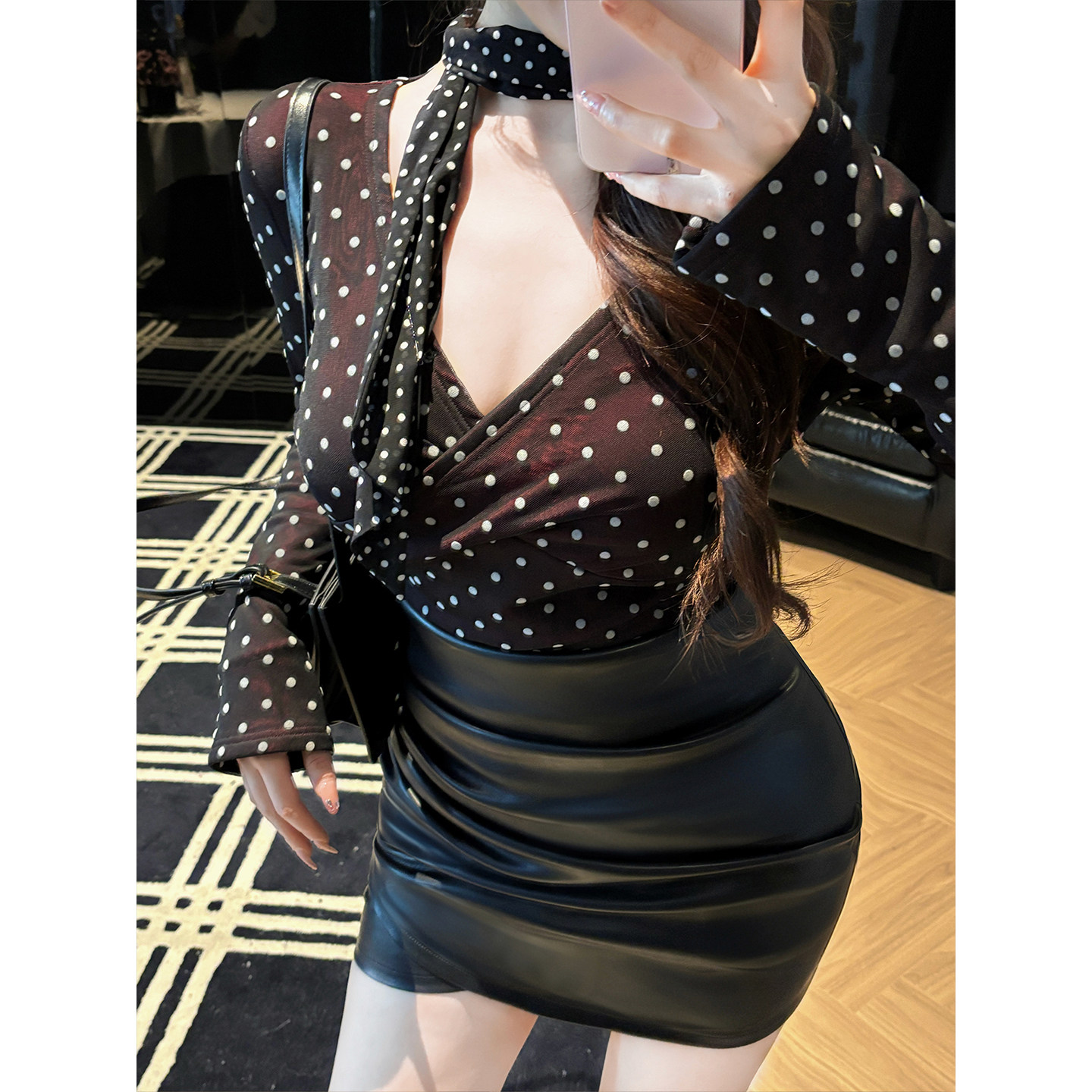 轻熟风V领波点黑色收腰带丝带性感显瘦上衣 大码 Babes 雾夜绮想