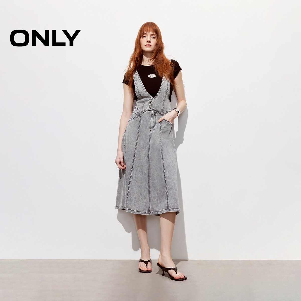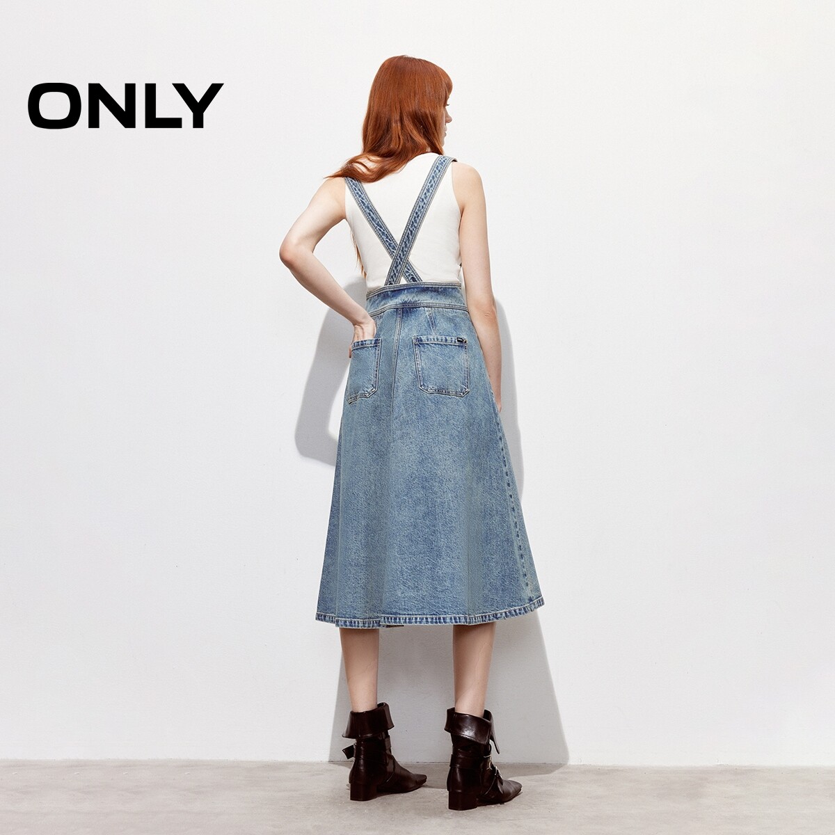 ONLY2026春季 摩登少女收腰可调节肩带伞裙背带牛仔连衣裙女 新款