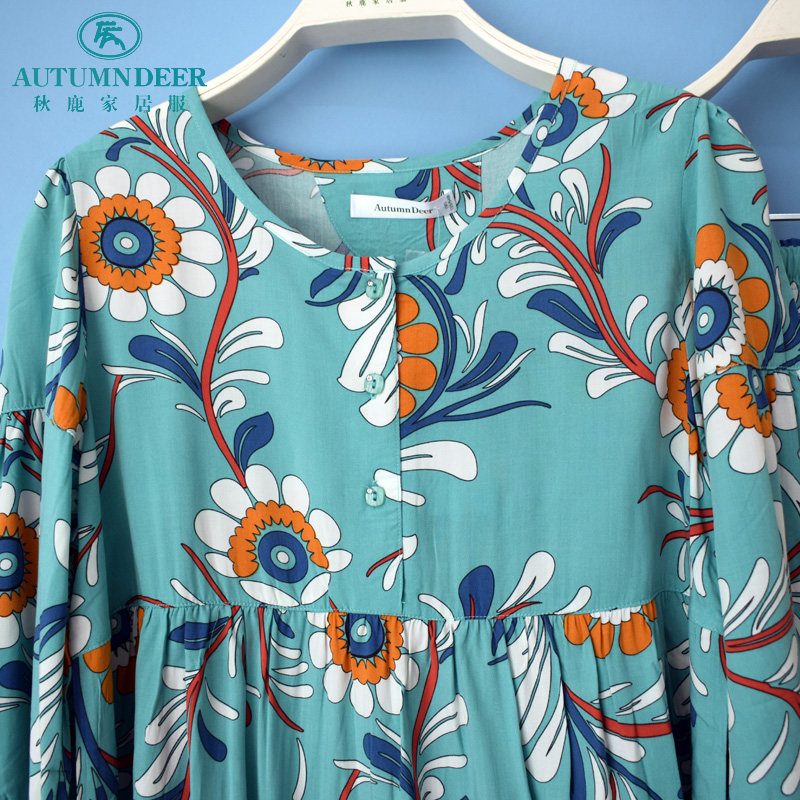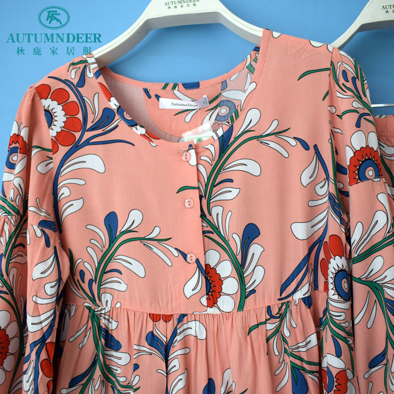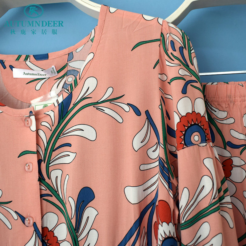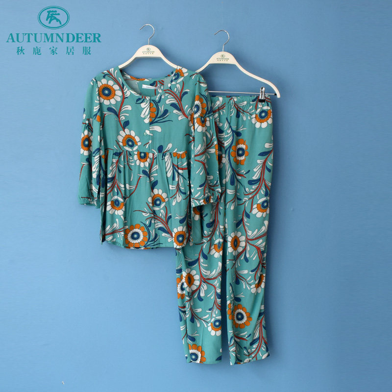休闲女薄家居服套 长裤 秋鹿睡衣专柜2020夏季 女梭织人棉印花八分袖