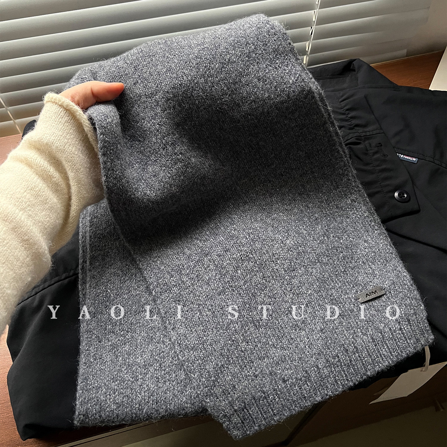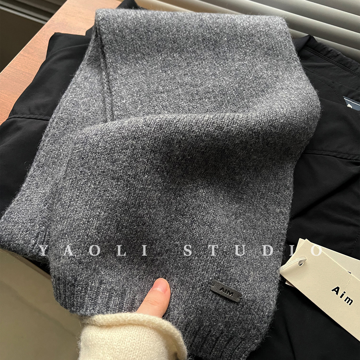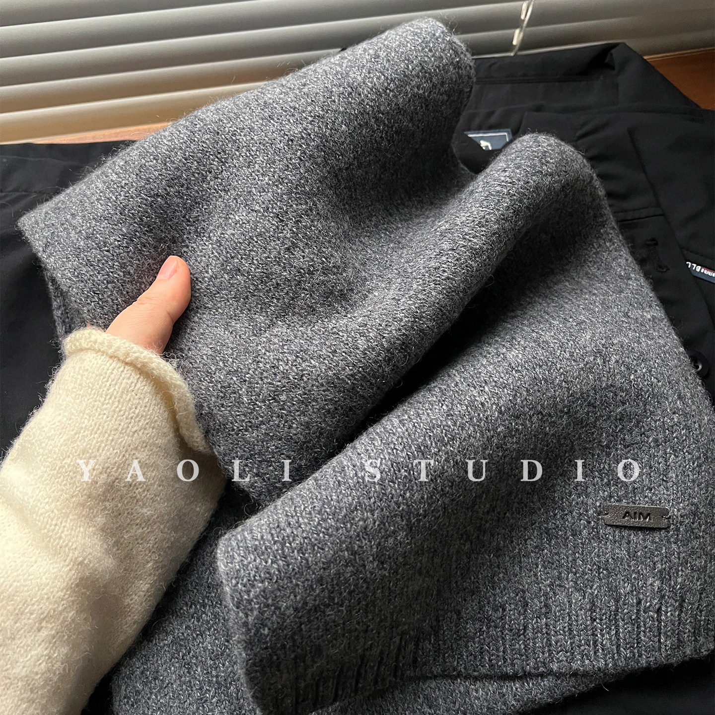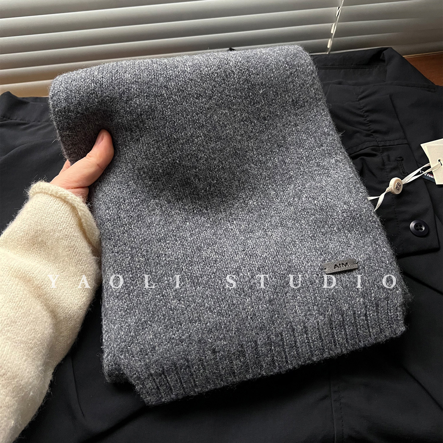 YAOLI深灰色~100羊毛纯色皮标AIM针织围巾女秋冬保暖护颈围脖韩