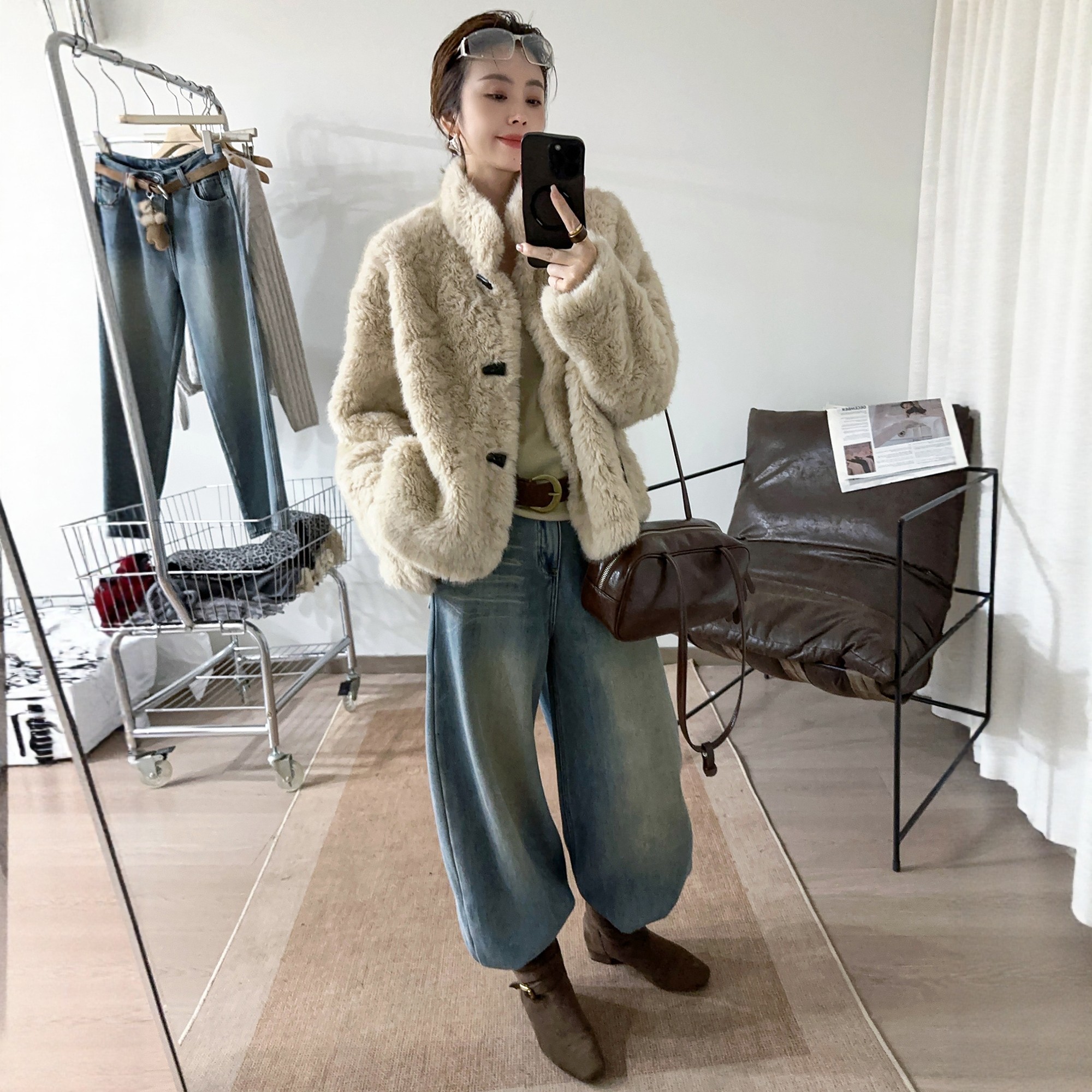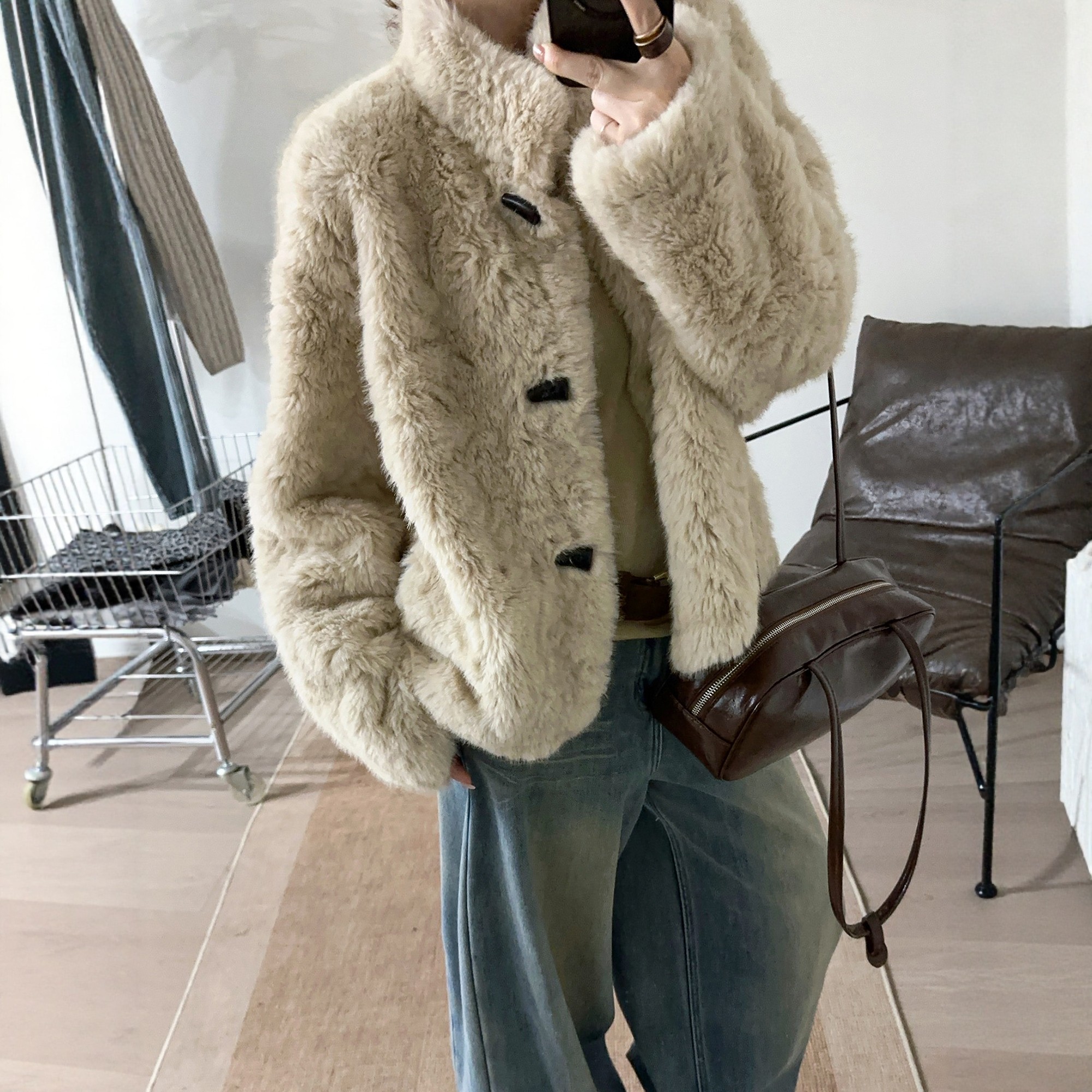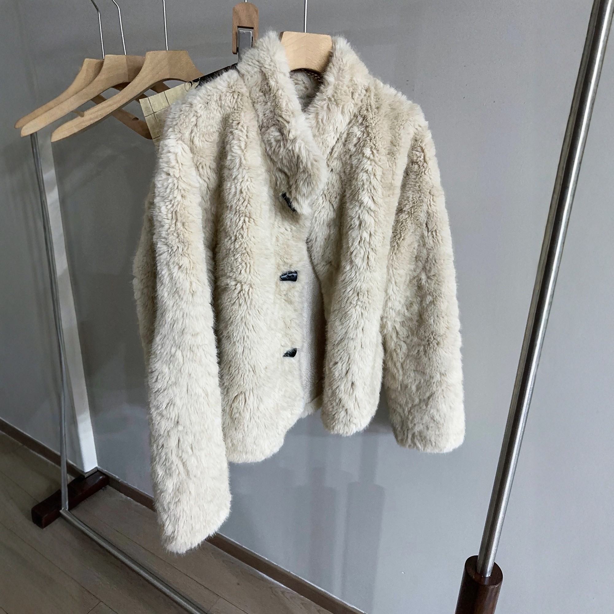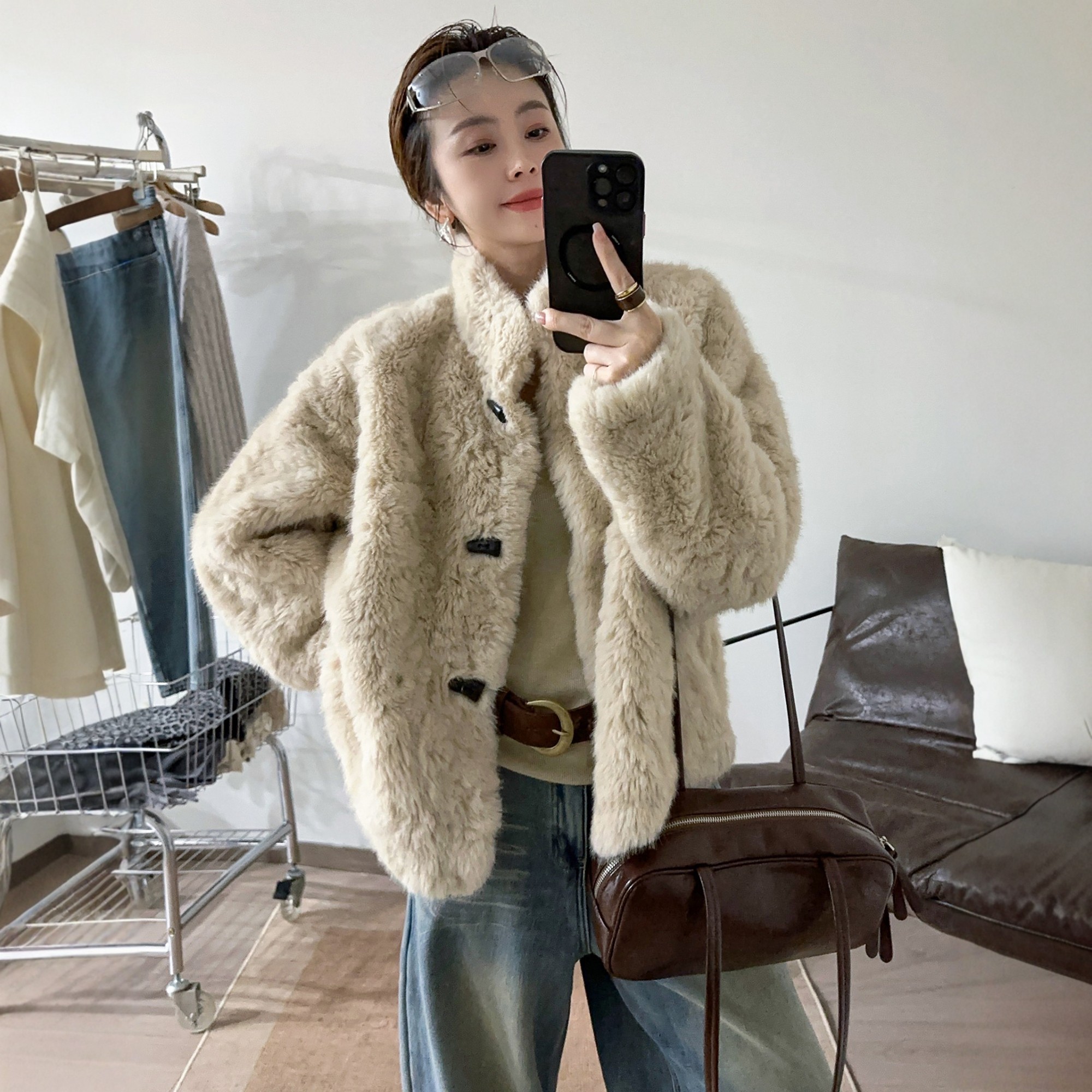 潮 欧货女装 牛角扣羊羔毛皮毛一体皮草短外套女欧洲站2025冬装 新款