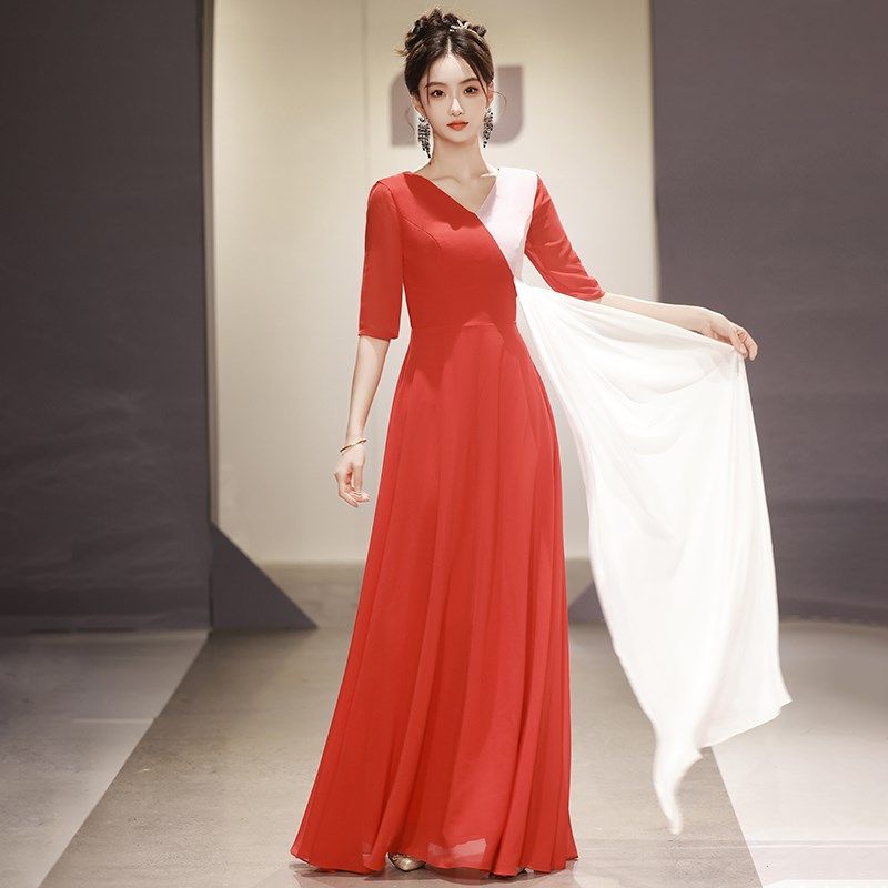 红色V领大合唱团演出女长款 裙主持红歌古筝舞蹈朗诵表演晚礼服装