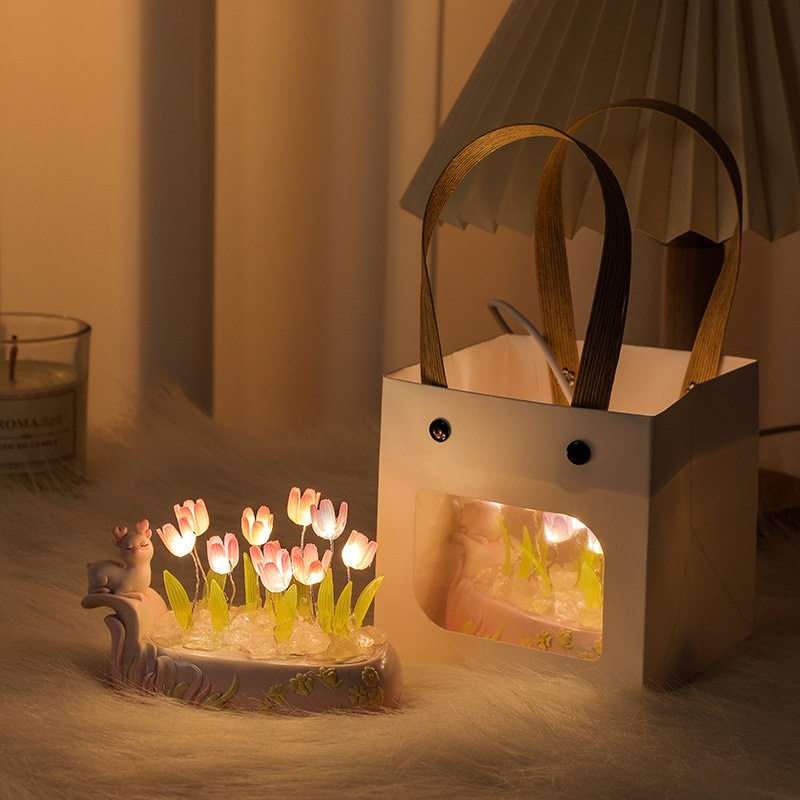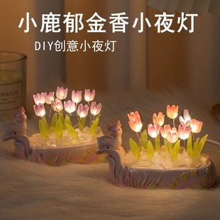 手工DIY小鹿仿真花郁金香小夜灯照明氛围灯送生日礼物装 饰小摆件