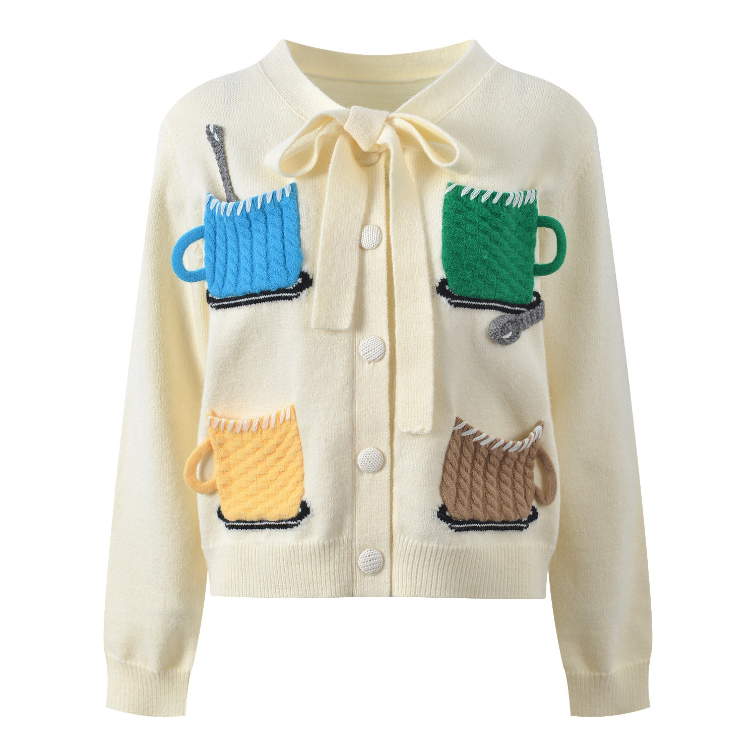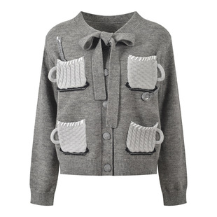 百搭针织开衫 趣味设计甜美清新咖啡杯飘带短款 上衣 新款 2025冬季