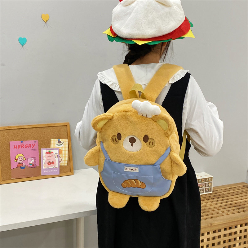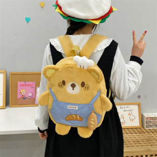 吉吉向上原创正品 卡通毛绒可爱双肩背包女 面包小棕熊背带裤