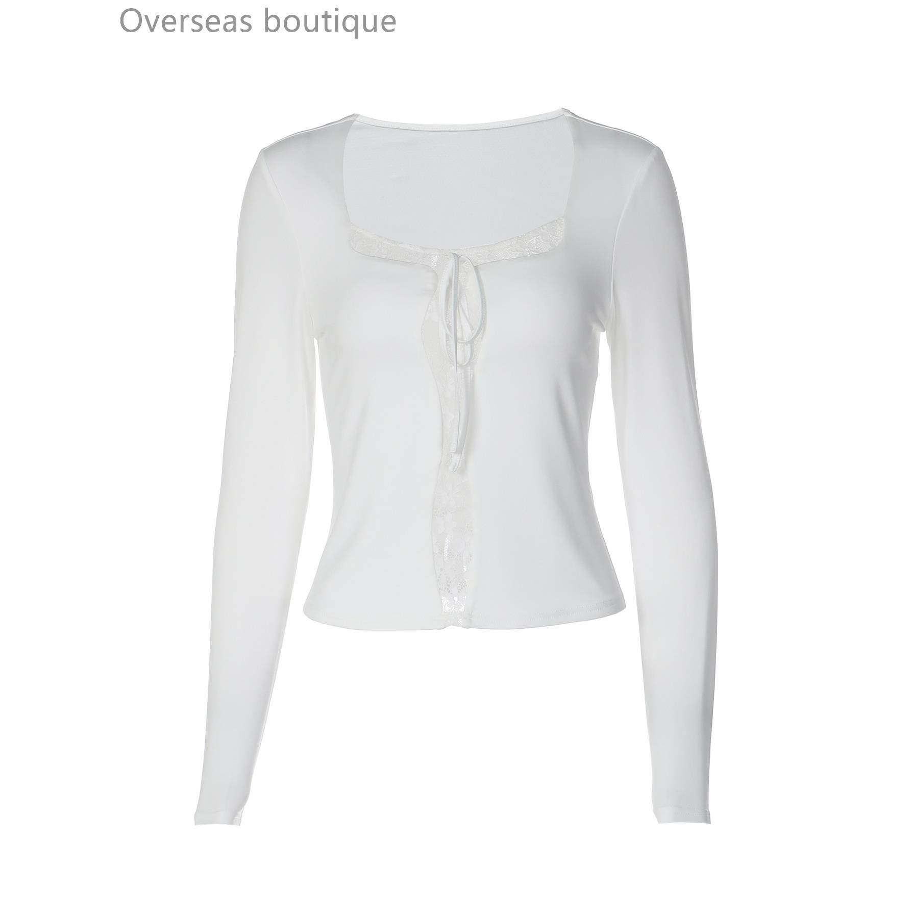 lace 打底衫 patchwork shirt蕾丝花边拼接方领女修身 base Lace
