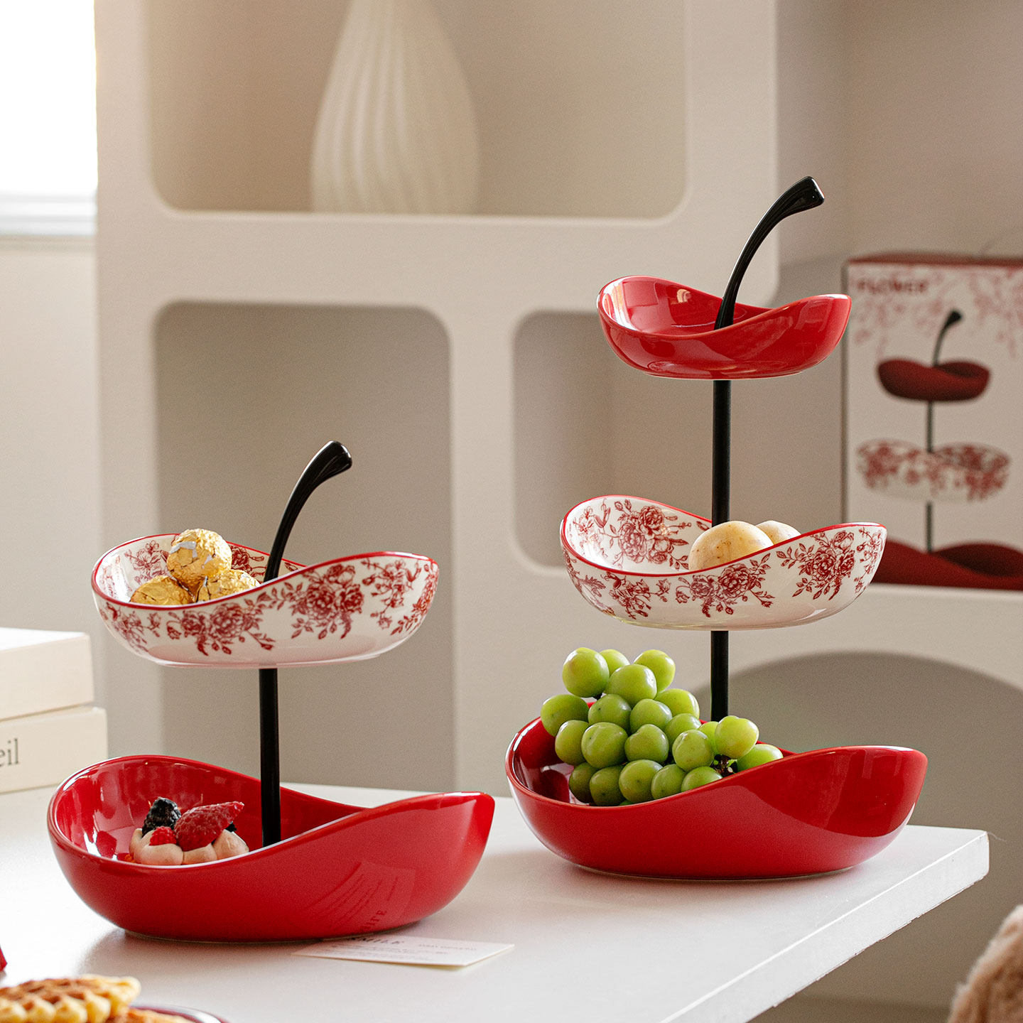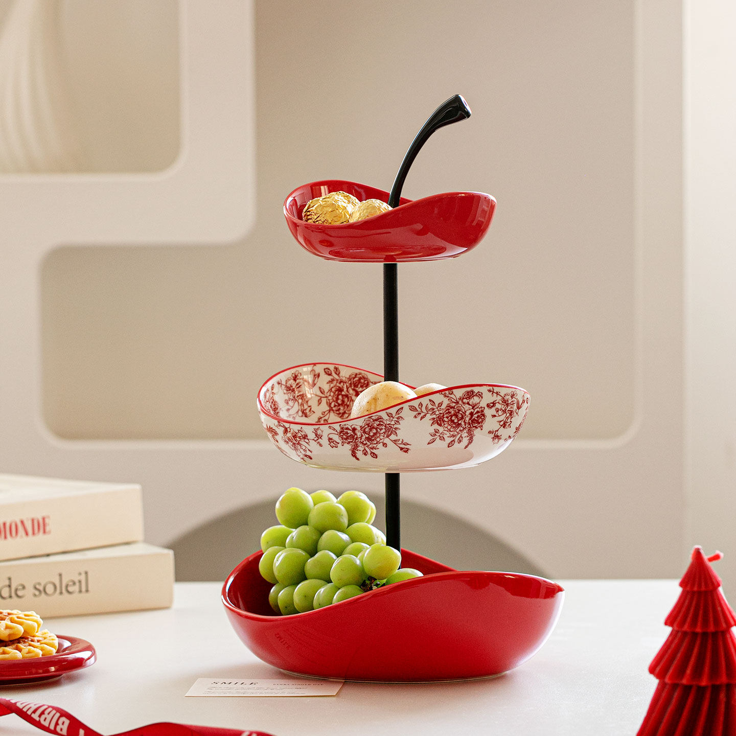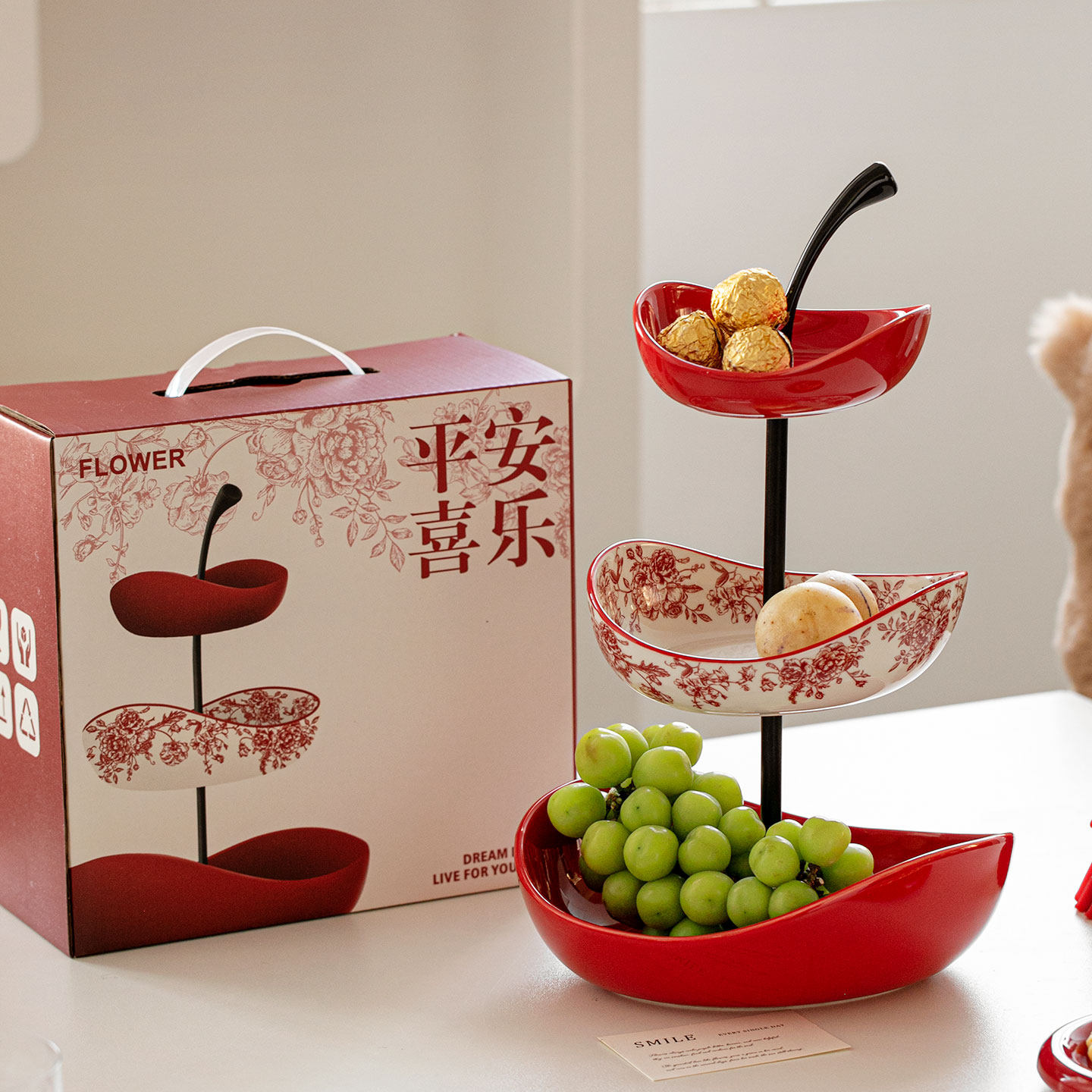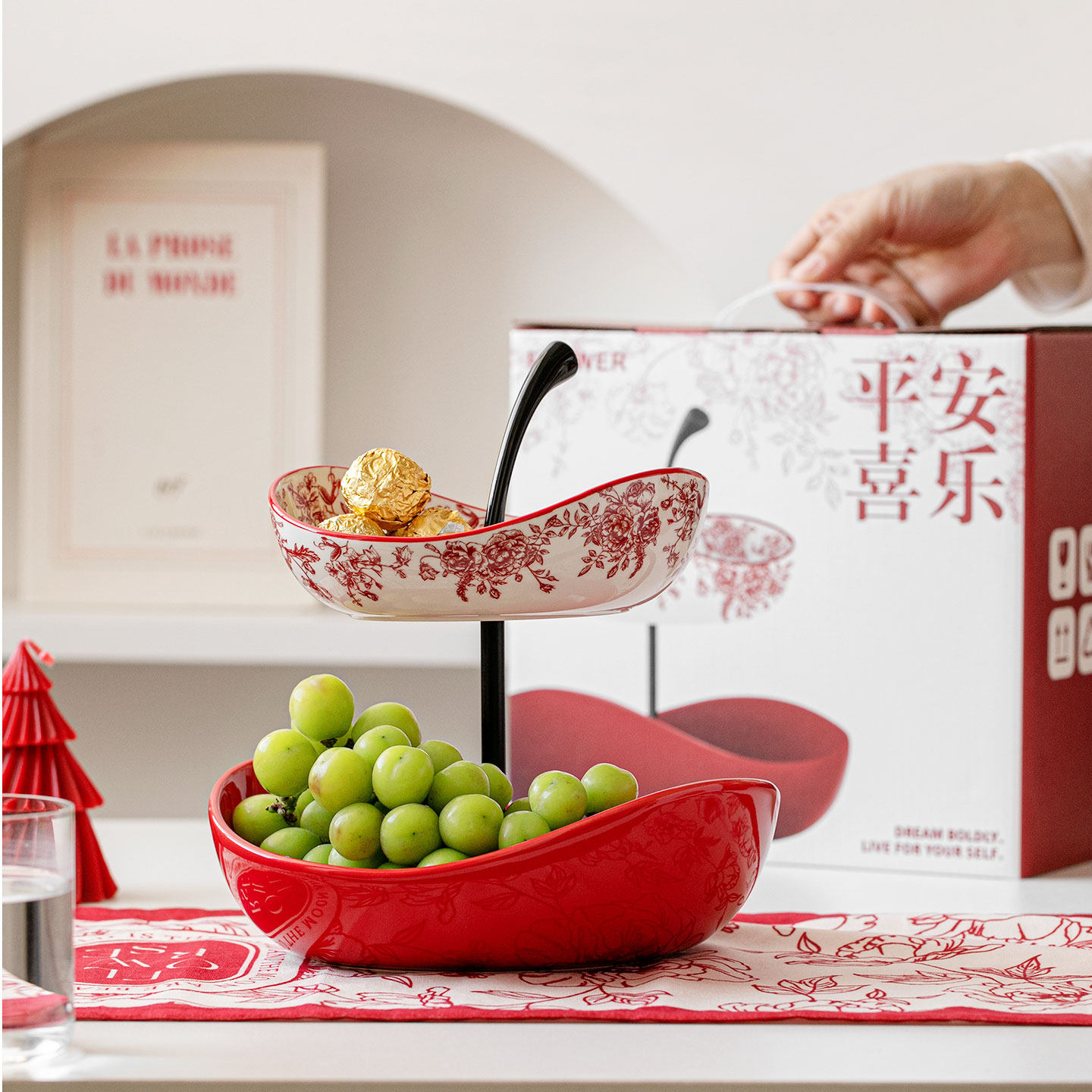 红色双层水果盘陶瓷果篓家用零食盘送礼摆件客厅茶几家用2025新款