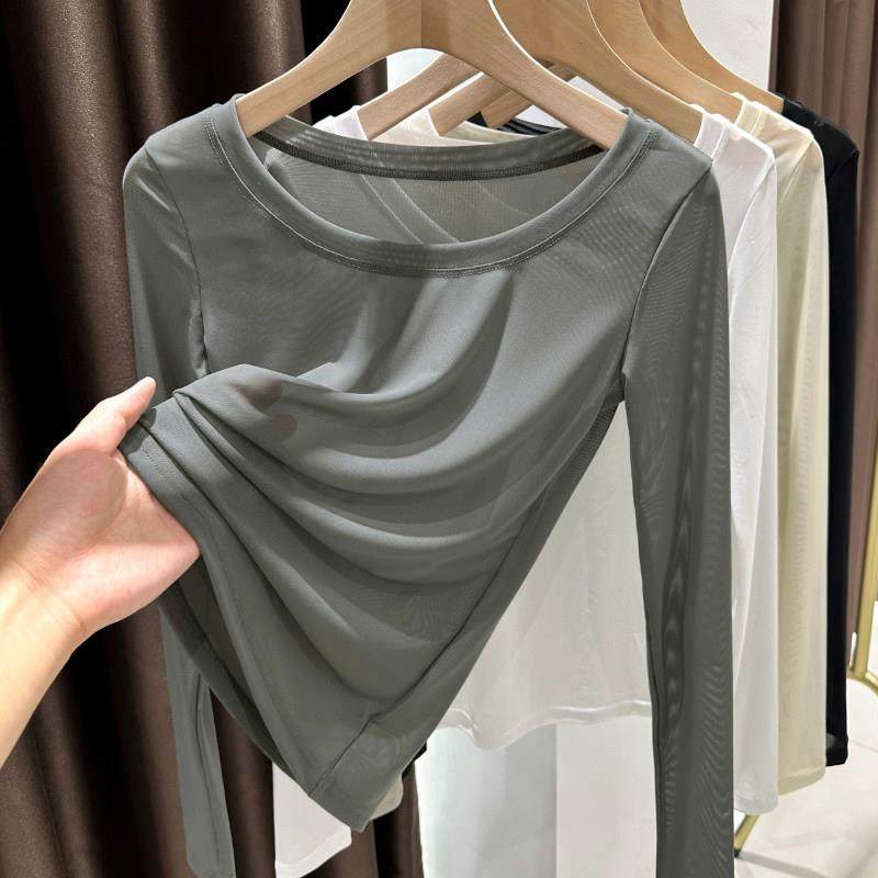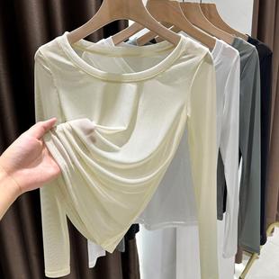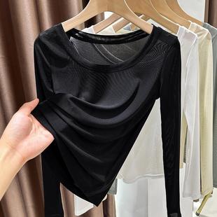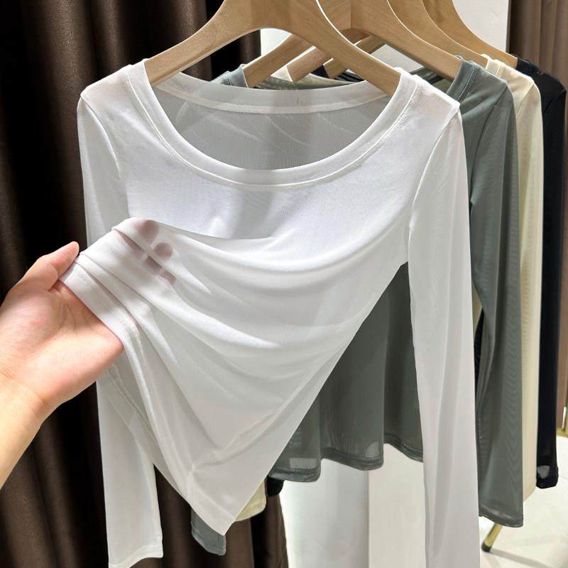 纱衣白色圆领蕾丝上衣1219e T恤高级修身 网纱打底衫 女轻薄内搭长袖