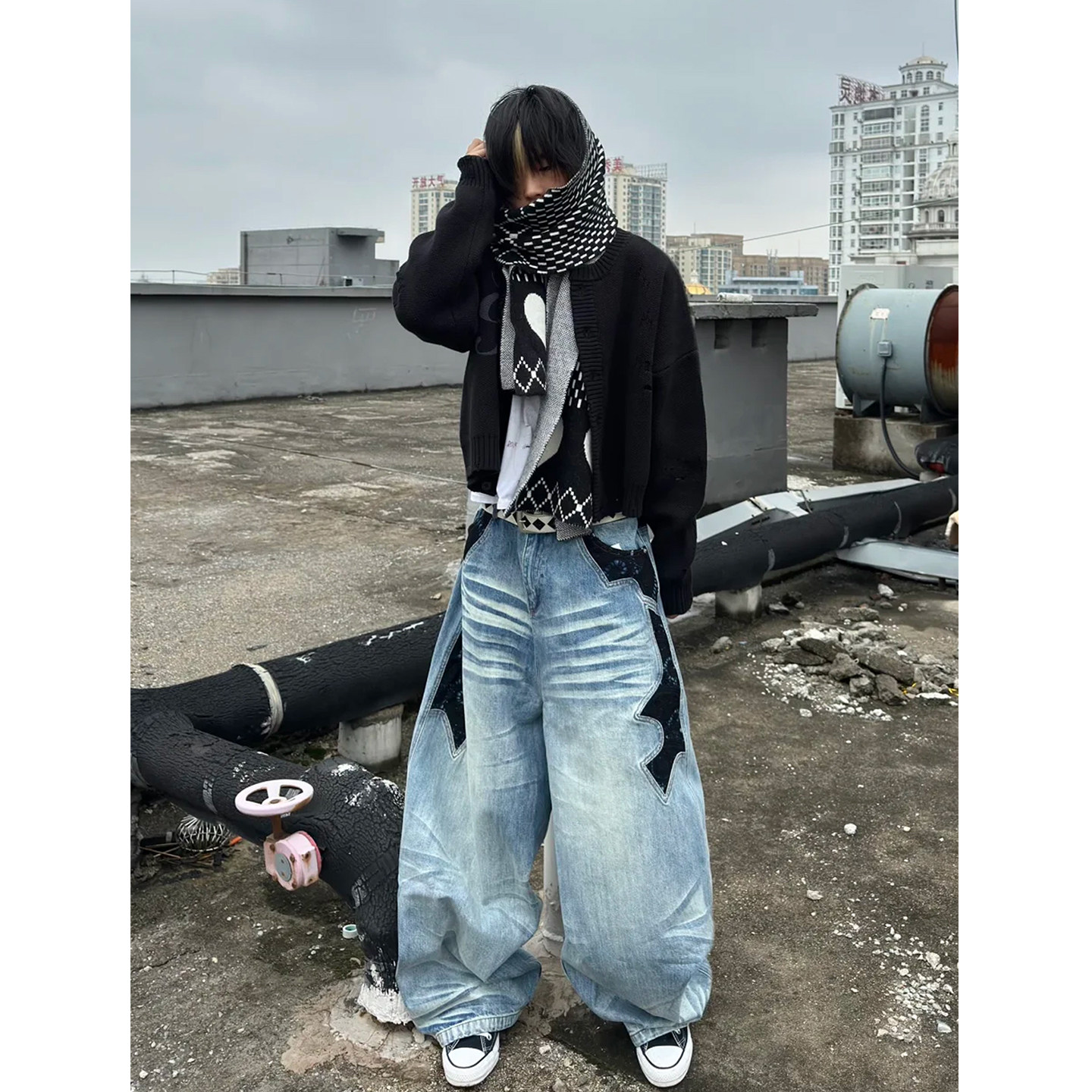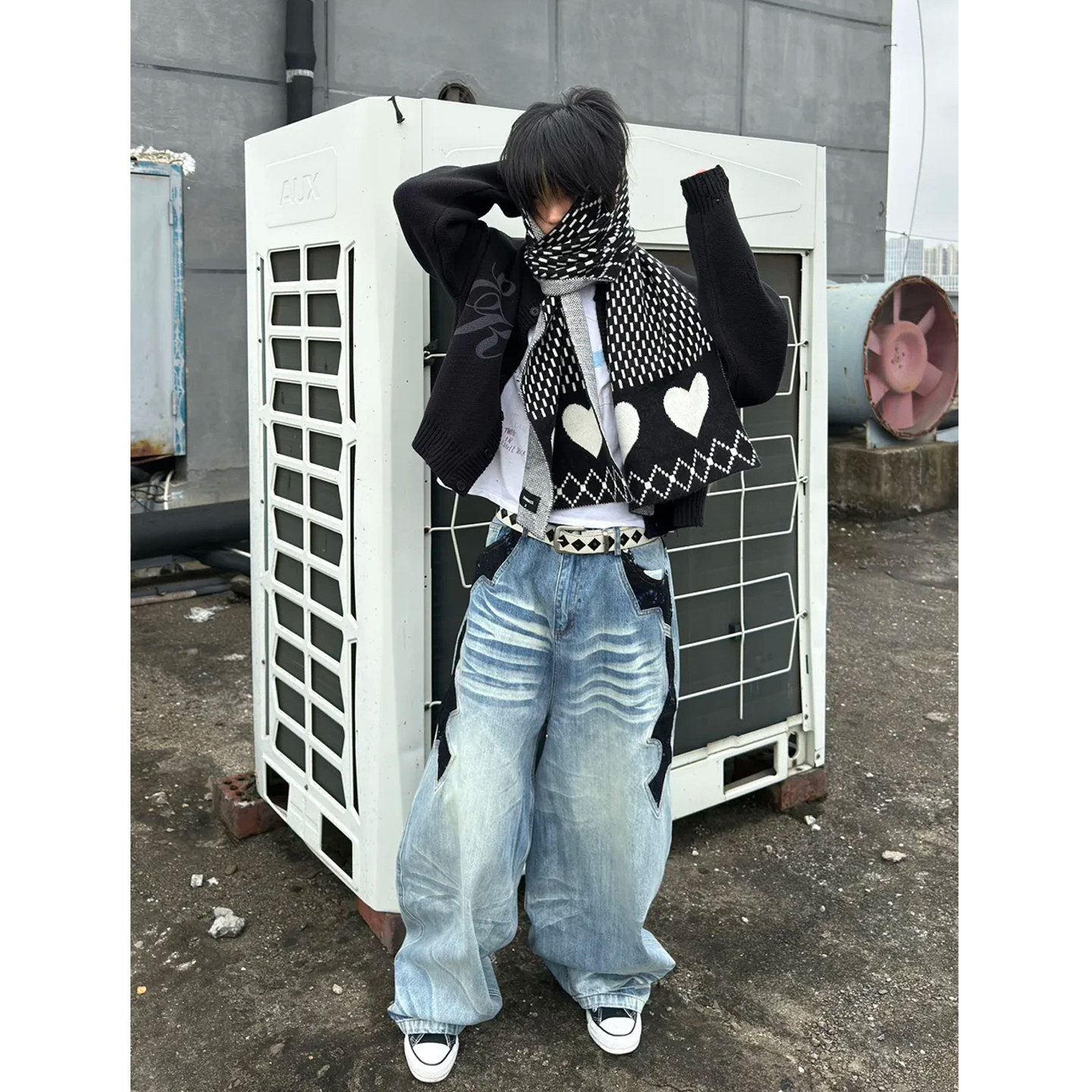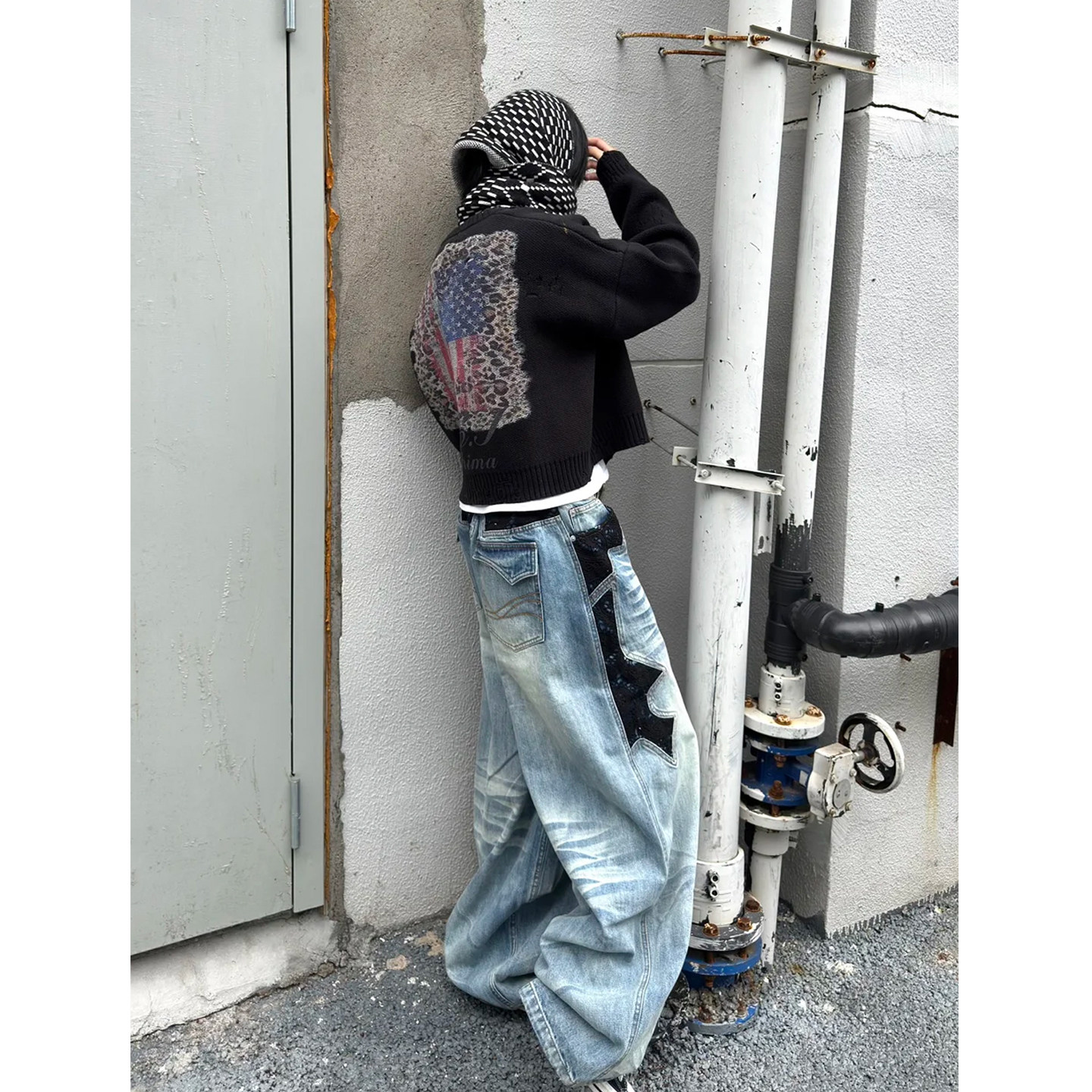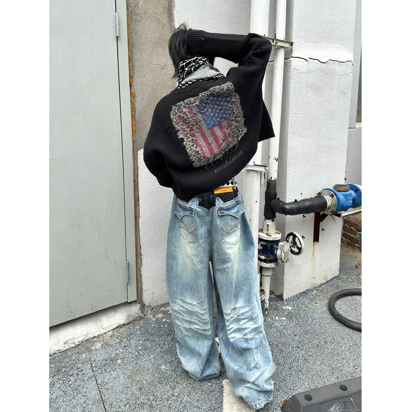 轻亚比风豹纹海军蓝旗帜开衫 外套 毛衣男女秋冬Vintage保暖针织衫