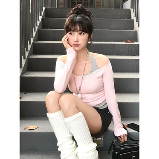 大码 t恤女秋冬吊带背心两件套打底上衣 胖mm韩系辣妹挂脖露肩长袖