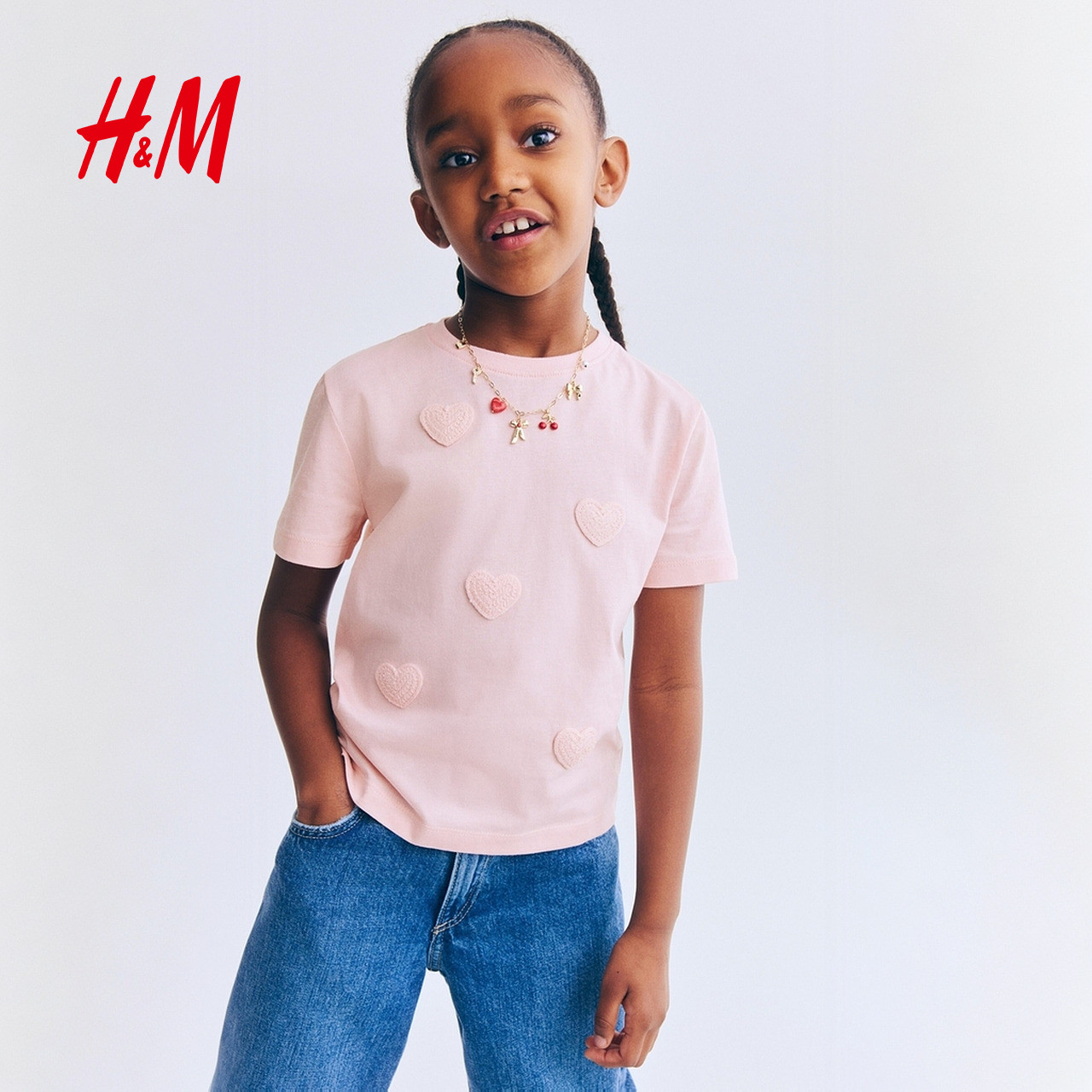 HM童装 上衣1302424 儿童女童T恤童趣立体图案森系田园风爱心短袖