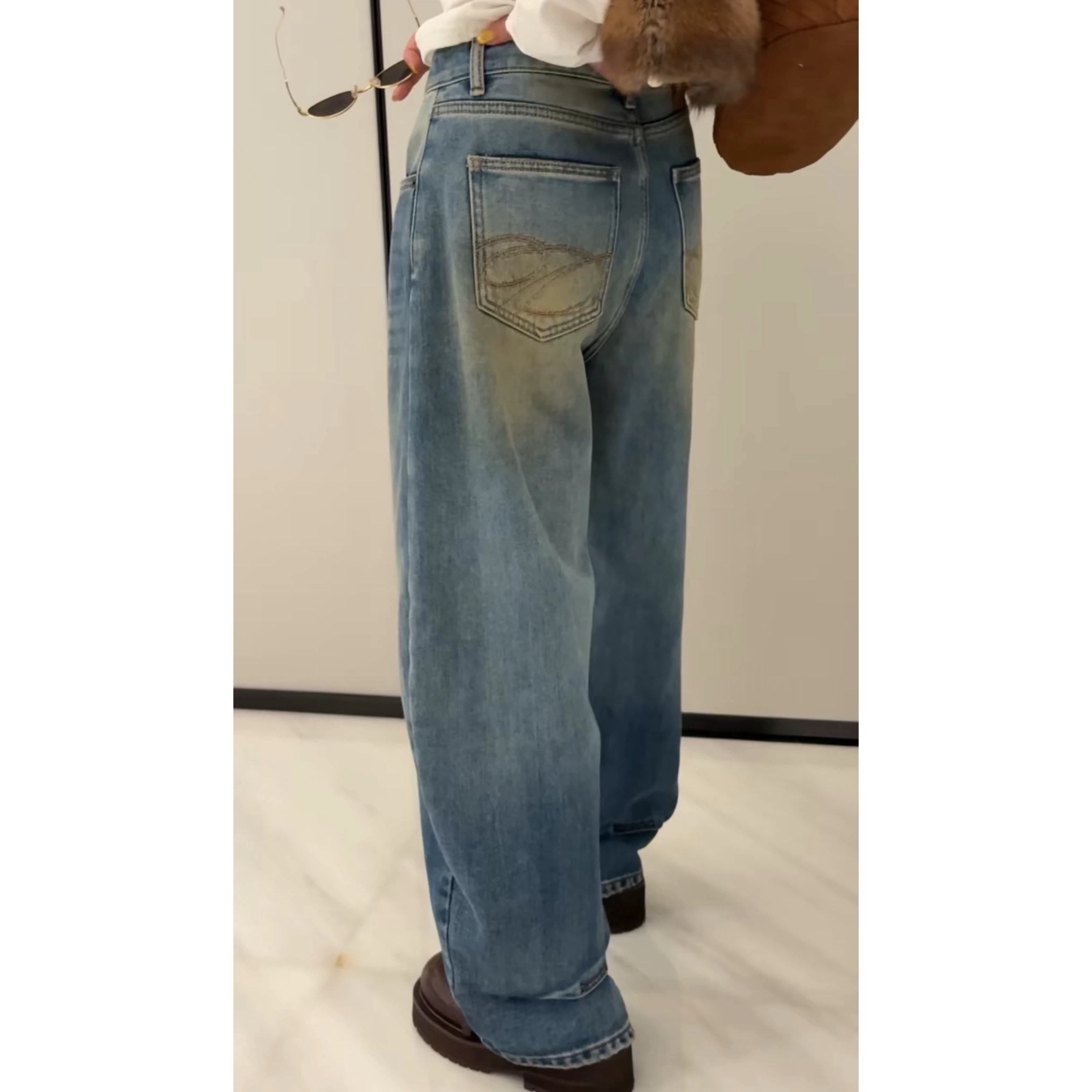 女 复古低腰显瘦y2k明线刺绣设计直筒牛仔长裤 TheDINA2025新款 美式