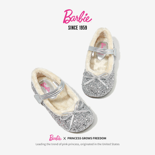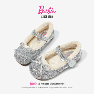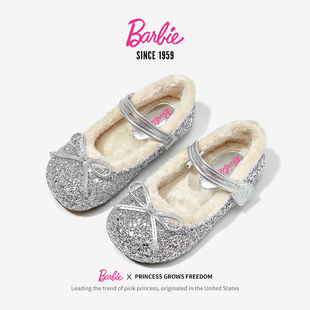 女童皮鞋 银色闪亮儿童水晶鞋 2025冬季 加绒女孩公主鞋 新款 芭比童鞋