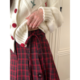 Even一雯 韩系高智100棉复古英伦风红黑格纹半裙 英伦女高半裙