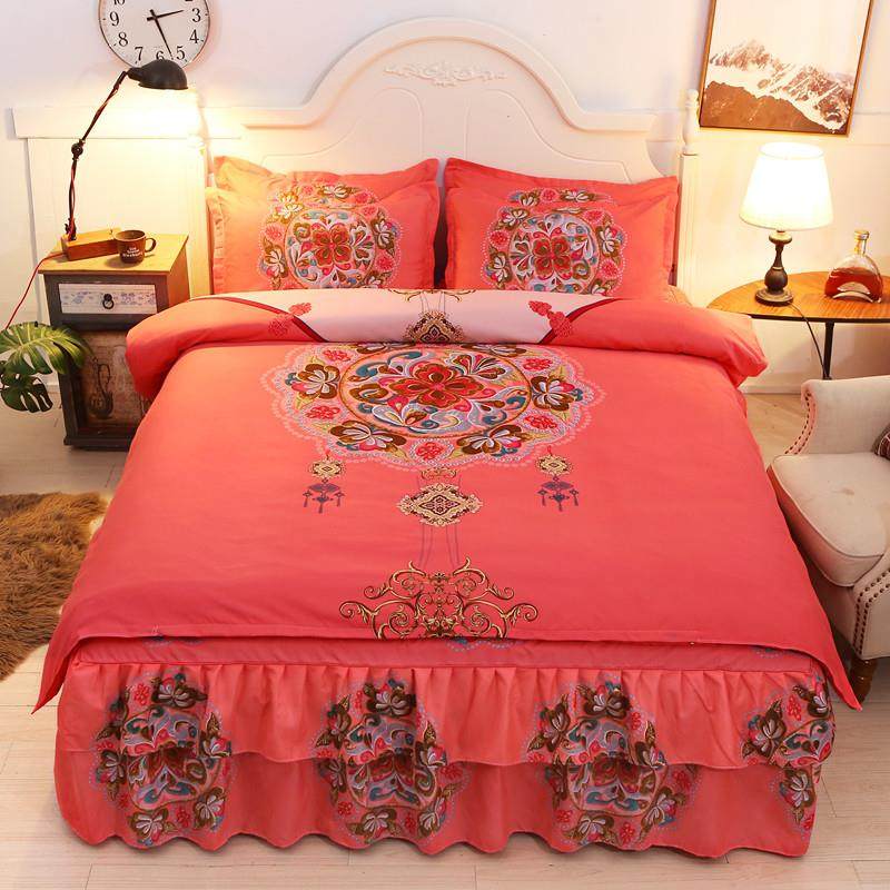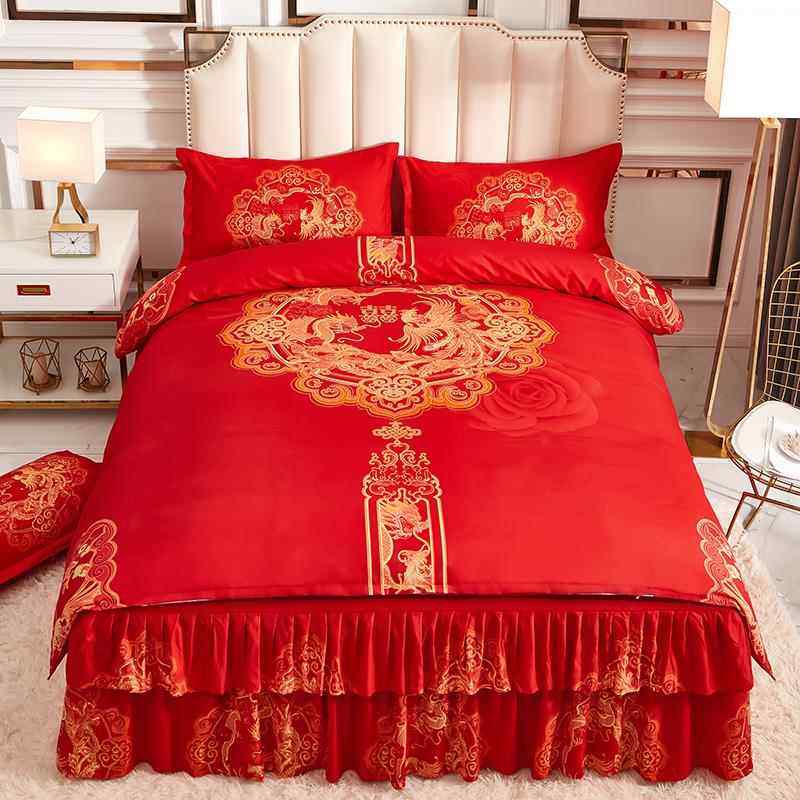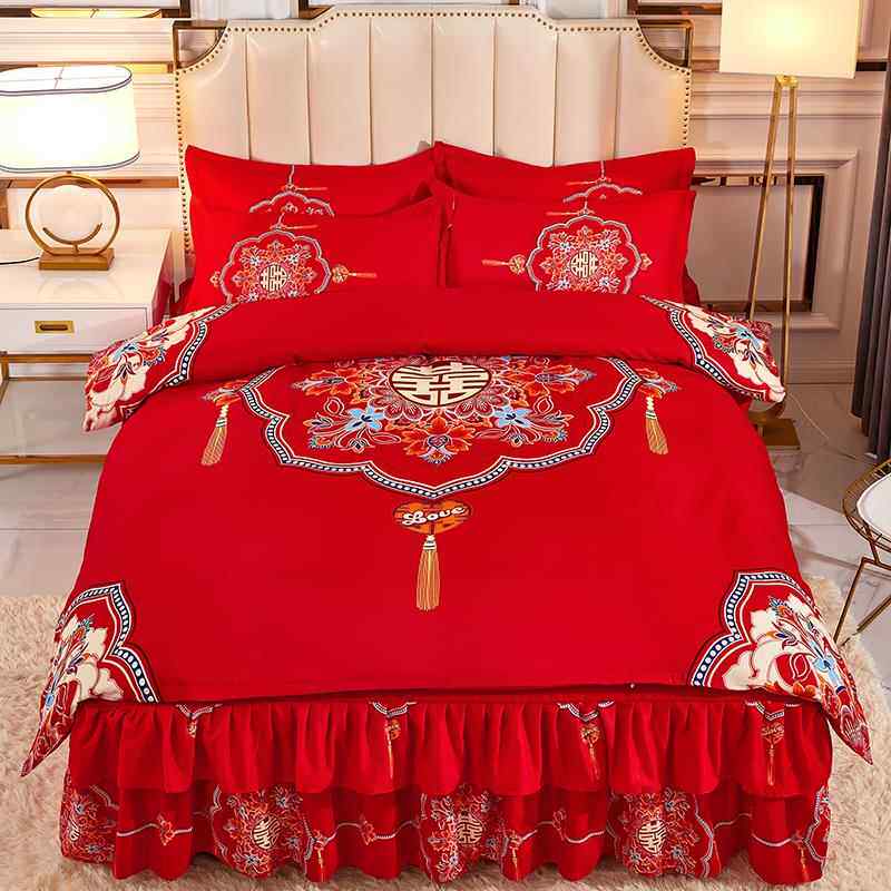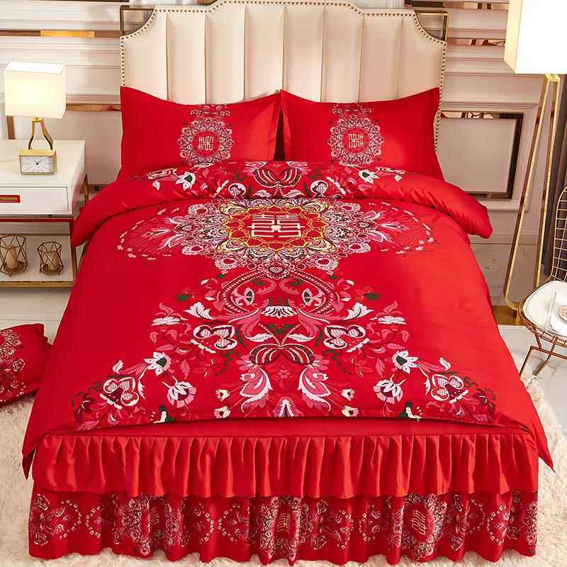 庆新婚大红色2.0米 全棉毛床单加中磨式 正品 厚纯棉婚四件套床裙式