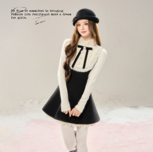 针织蕾丝秋冬新款 法式 爱丽丝 赫本掐腰千金风毛呢连衣裙 BLUE