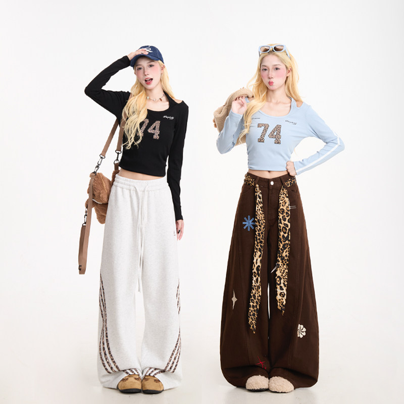 显瘦短上衣 T恤女挂脖设计感修身 NERESUM美式 甜酷豹纹数字印花长袖