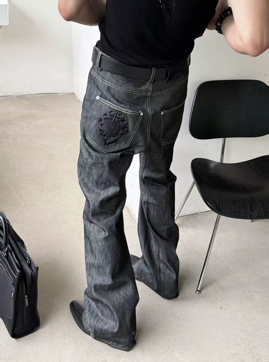 宽松独特设计感长裤 胖胖哥腊肠狗刺绣牛仔裤 直筒大码 秋季 子潮 男款