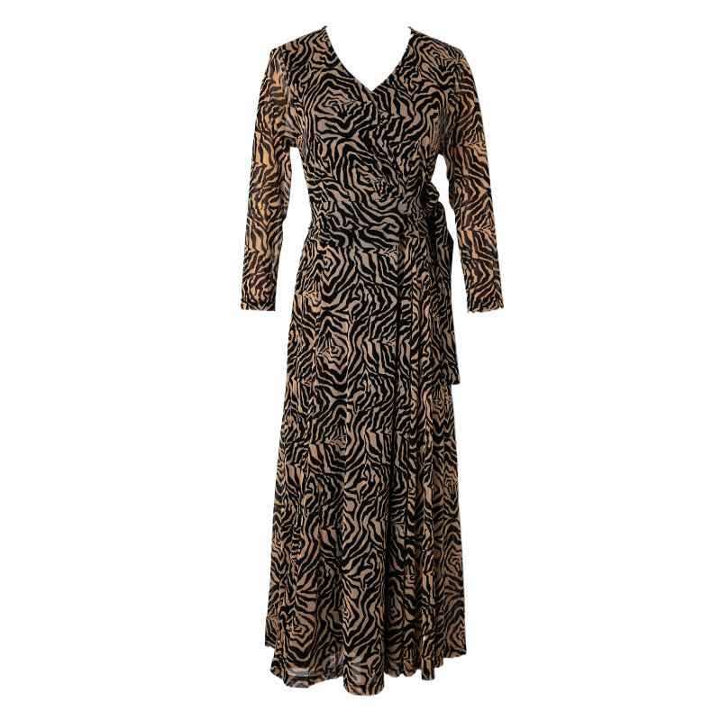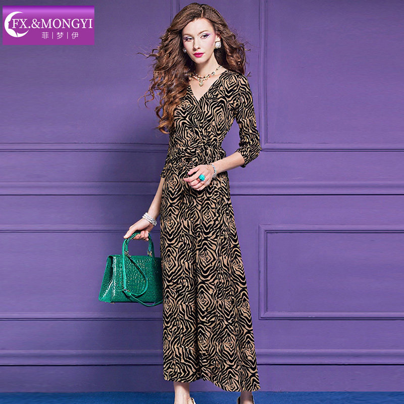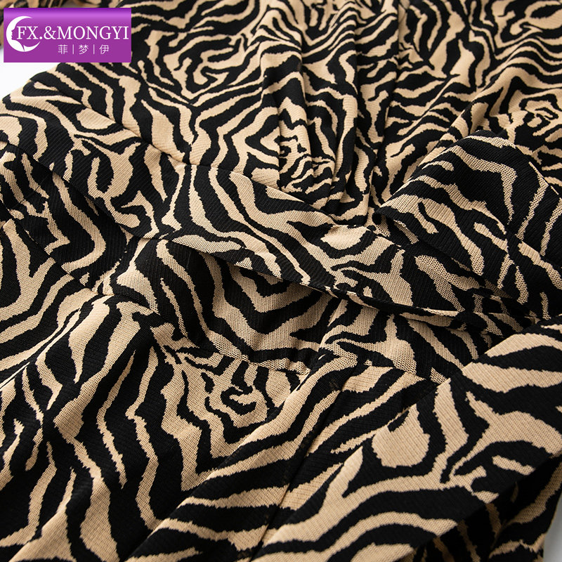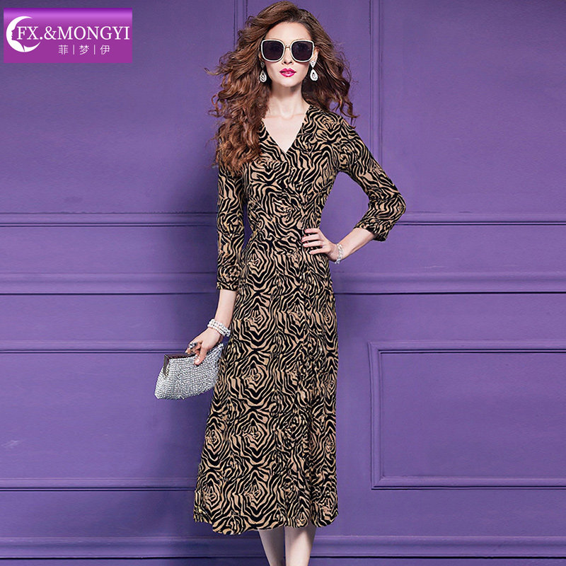 菲梦伊豹纹印花连衣裙女秋季 打底裙子 复古时髦显瘦收腰V领中长款