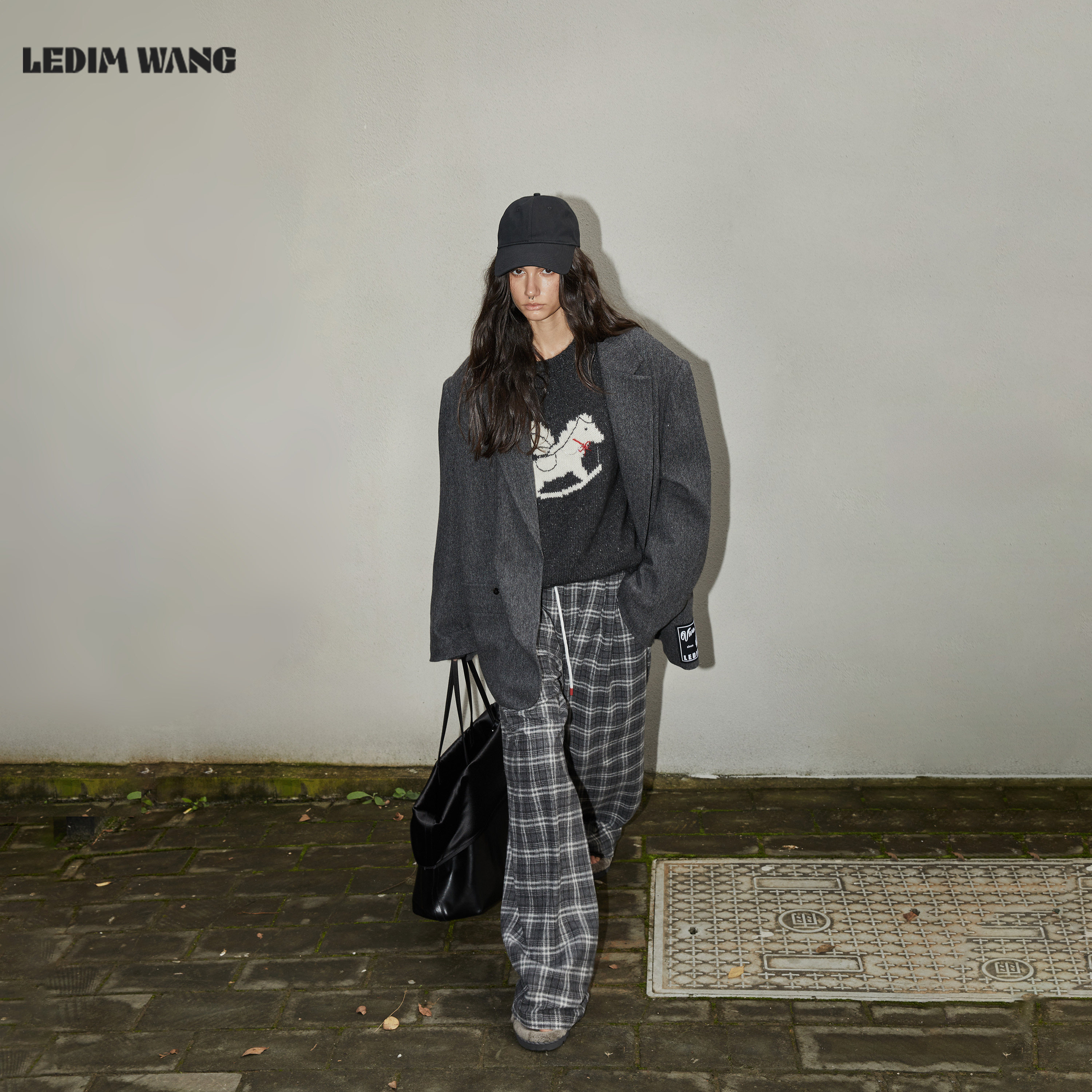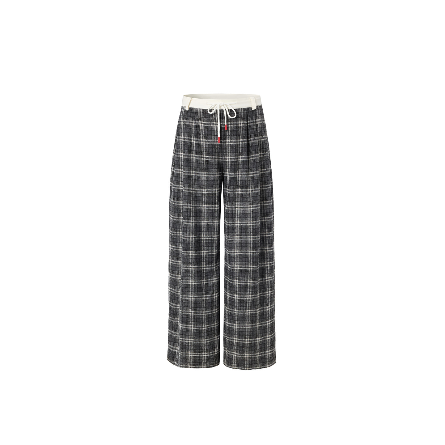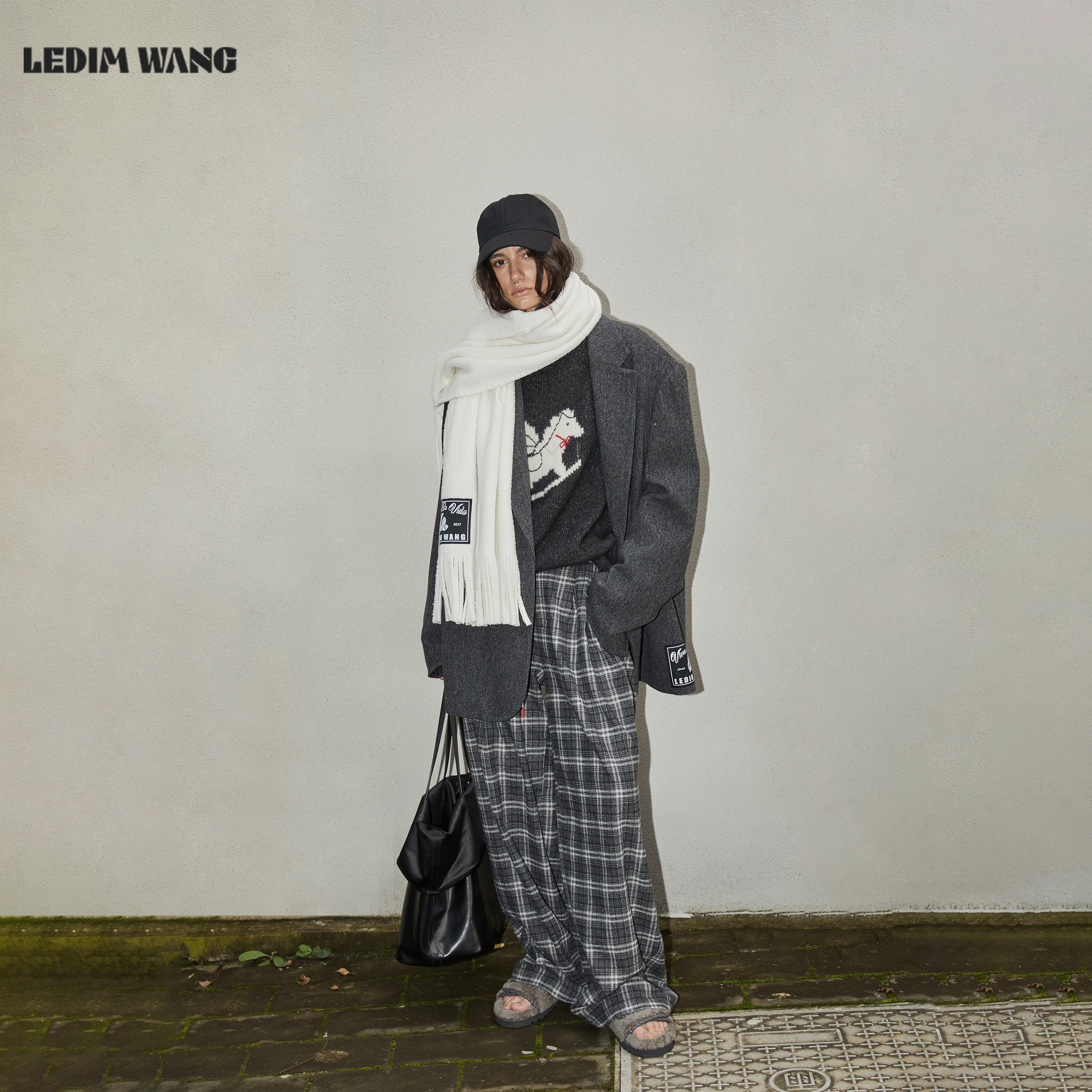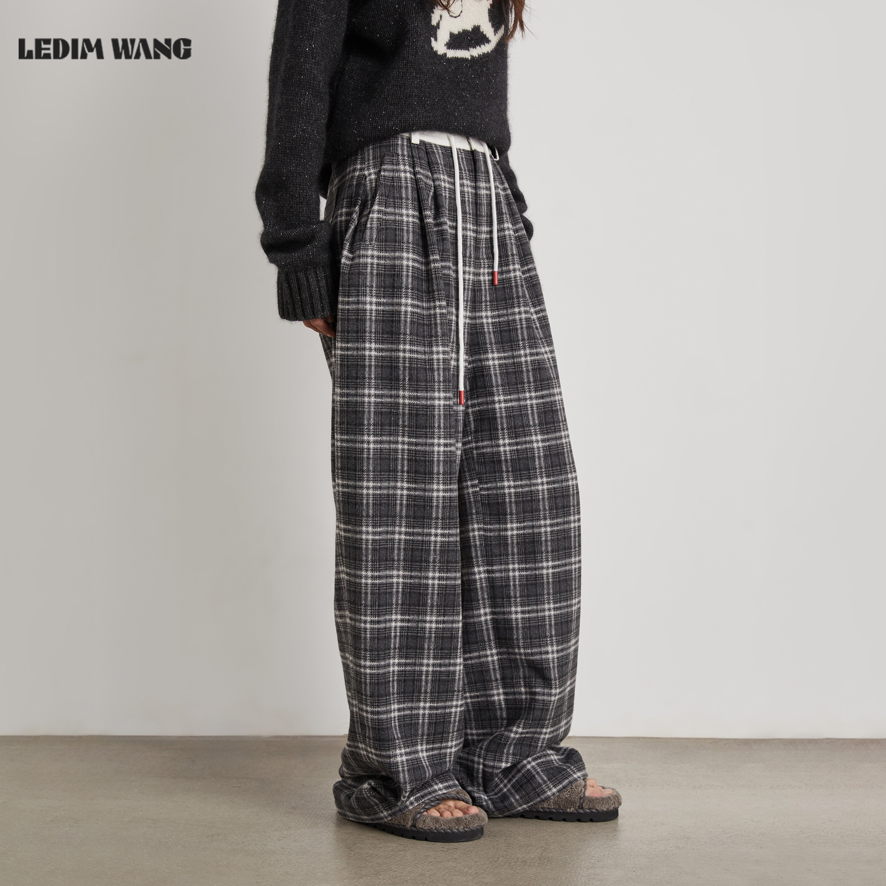 明星同款 阔腿裤 LEDIM 女新款 格子长裤 WANG灰白粗呢格纹休闲裤