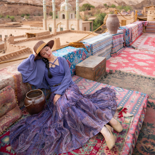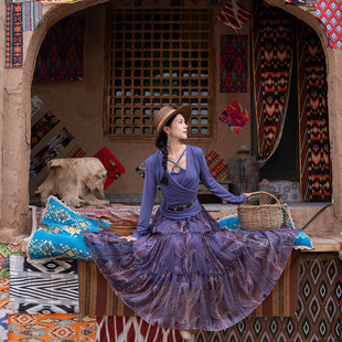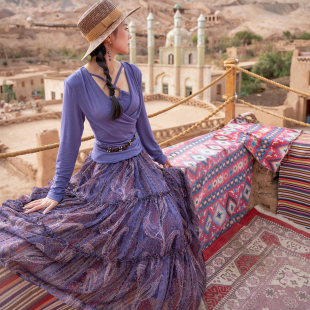 半身裙套装 理想三旬旅行女装 复古波西米亚民族风紫色上针织打底衫